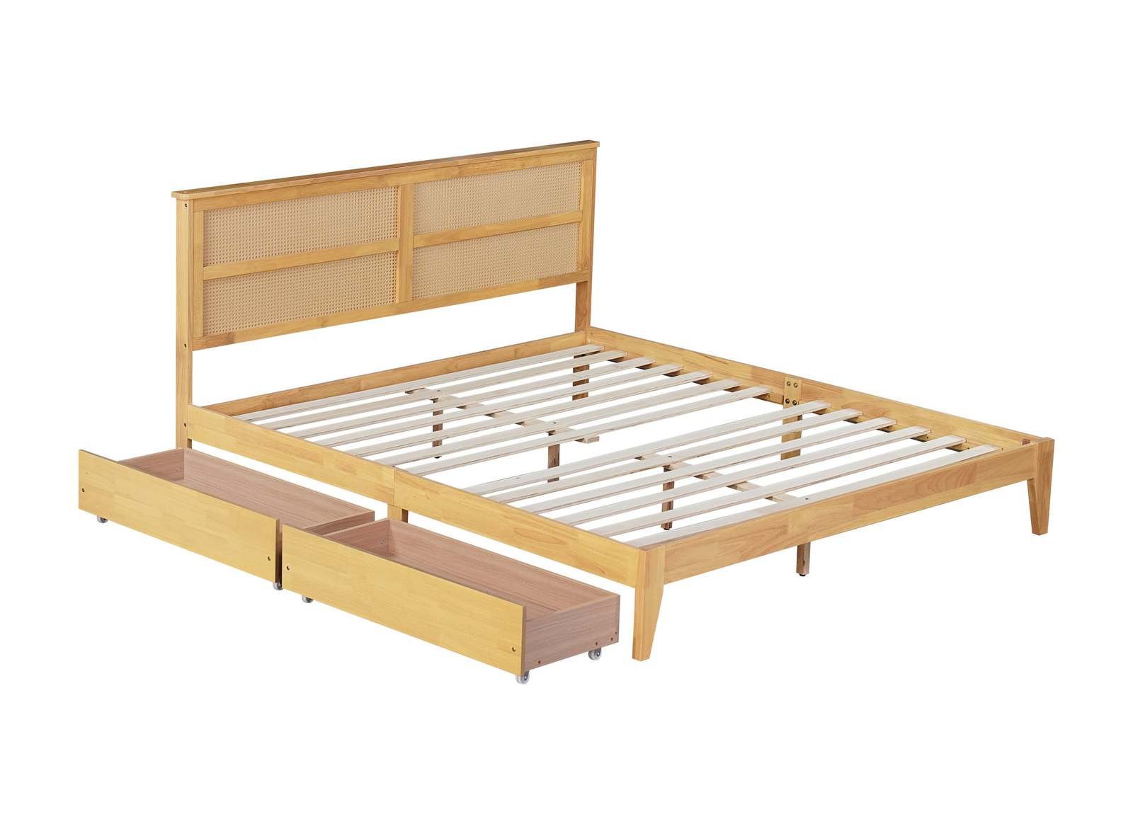 King Size Bed with Rattan Headboard, Two Storage Drawers