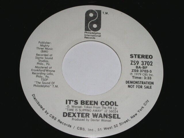 This is a white label promotional 45 rpm phonograph record by Dexter Wansel entitled, "It's Been Cool". Same flipside. Record label: Philadelphia International ZS9 3702. Comes with the original paper sleeve making this all the nicer.