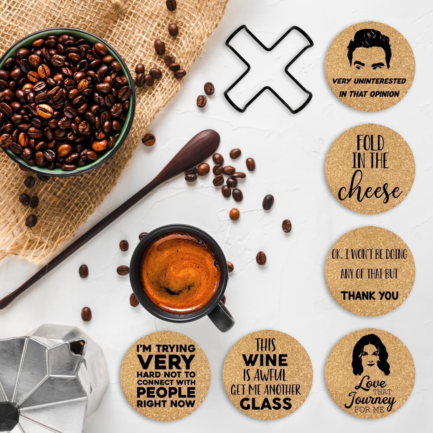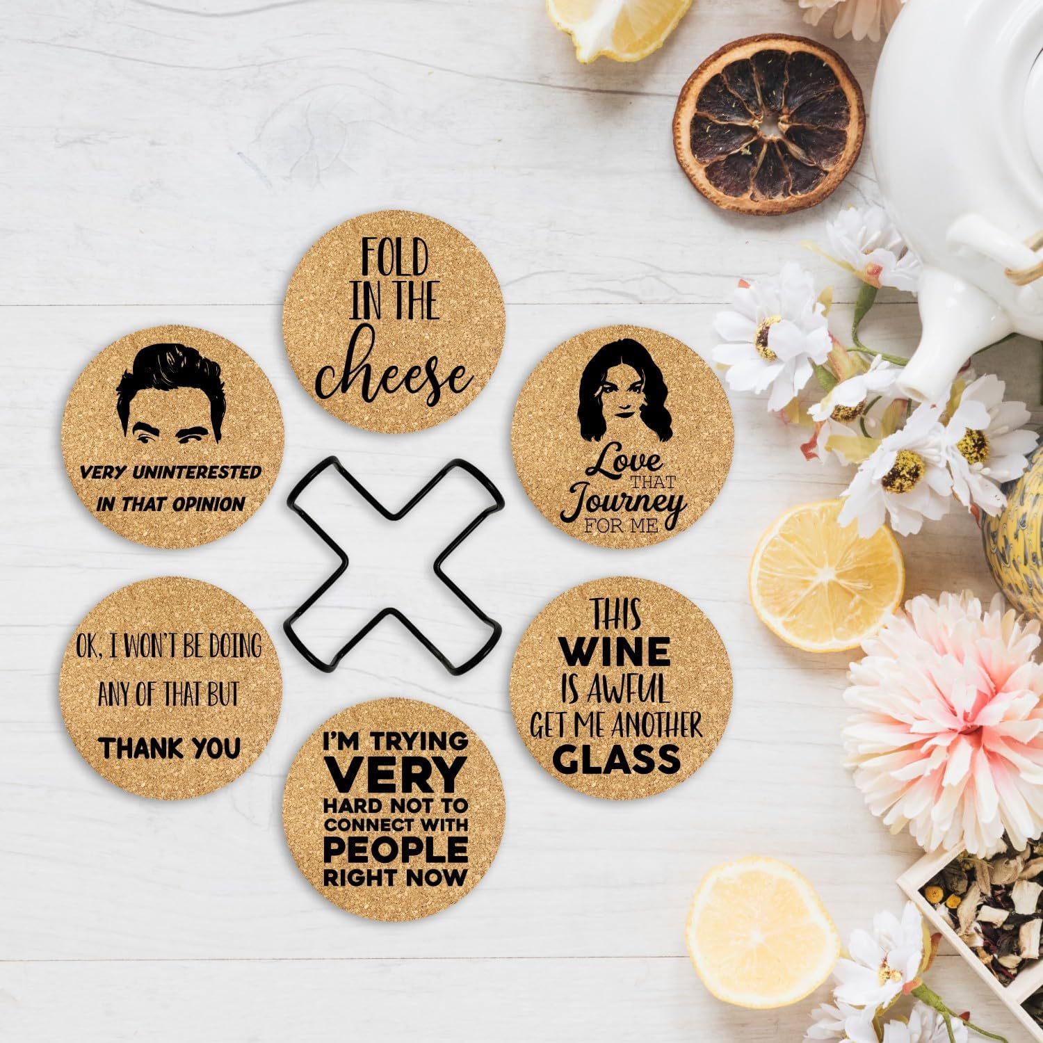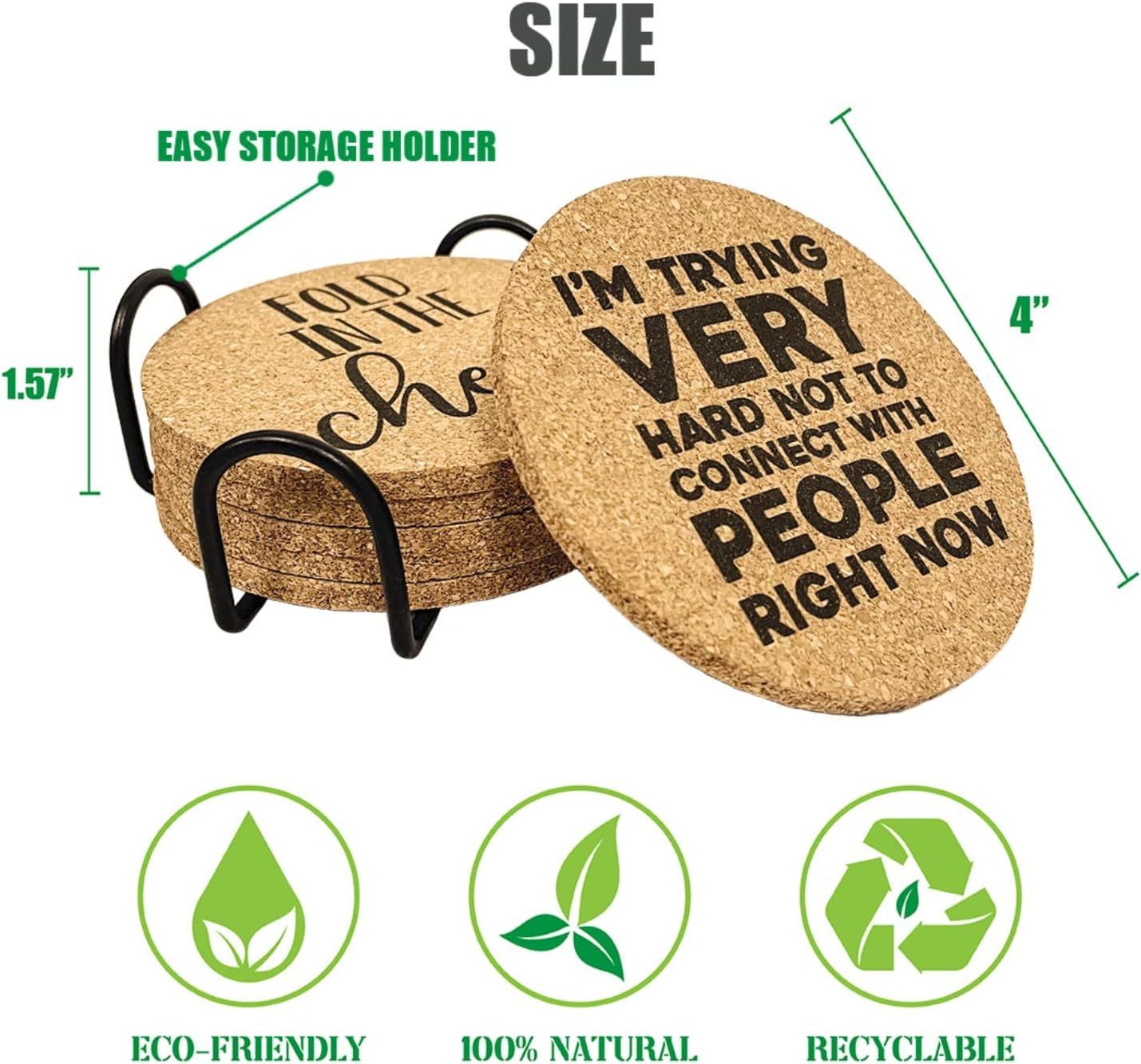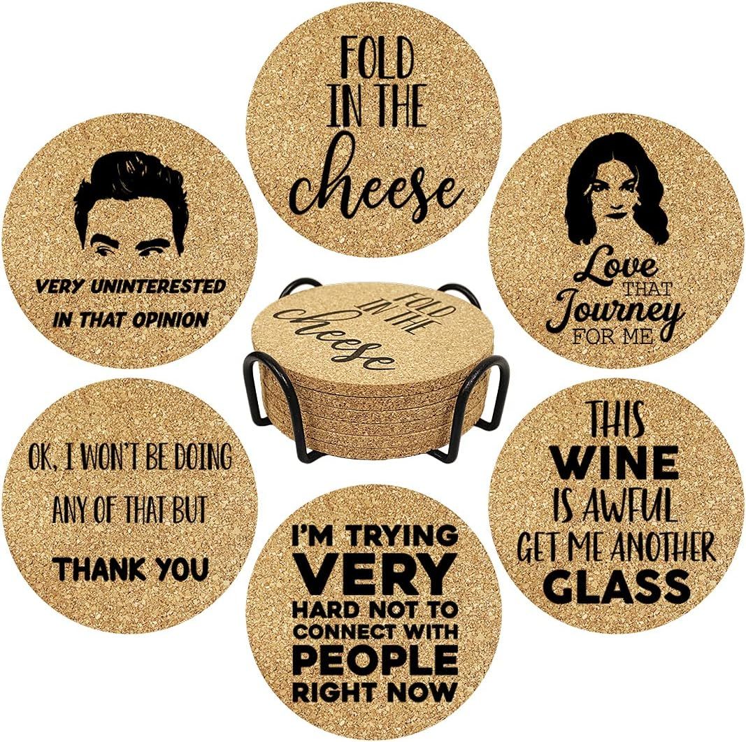 DESIGN FOR FUN - This set of Cork Coasters is designed for those who love the show, and they absolutely will bring much more laugh and topics to your home. Perfect GIFT IDEA - One set includes 6pcs drink coasters with different sayings. Coasters Come with metal holder for easy organization, Perfect as a fun but functional gift for housewarming hostess gifts, Birthday, Christmas, Thanksgiving day, family gatherings, mother's day. Brighten up your home with these cute and funny coasters! HIGH QUALITY MATERIAL - Made from 100% real cork, eco-friendly, absorbent and durable. Very gentle to your table surfaces and prevent your furniture from Scratched, and won?t cause damage like marble or stone if accidentally dropped. SUITABLE SIZE - 3.93*3.93*0.2 inch (10*10*0.5cm), fit most glass, cups, mugs, wine bottle or even cereal bowl or a pitcher for drink, 5mm thick enough to absorb any moisture and protect your table from white ring marks. FARMHOUSE DECOR STYLE - These funny cork coasters can also be a great decoration to your house, start your wonderful day with a cup of water, coffee or milk on these cute coasters!
