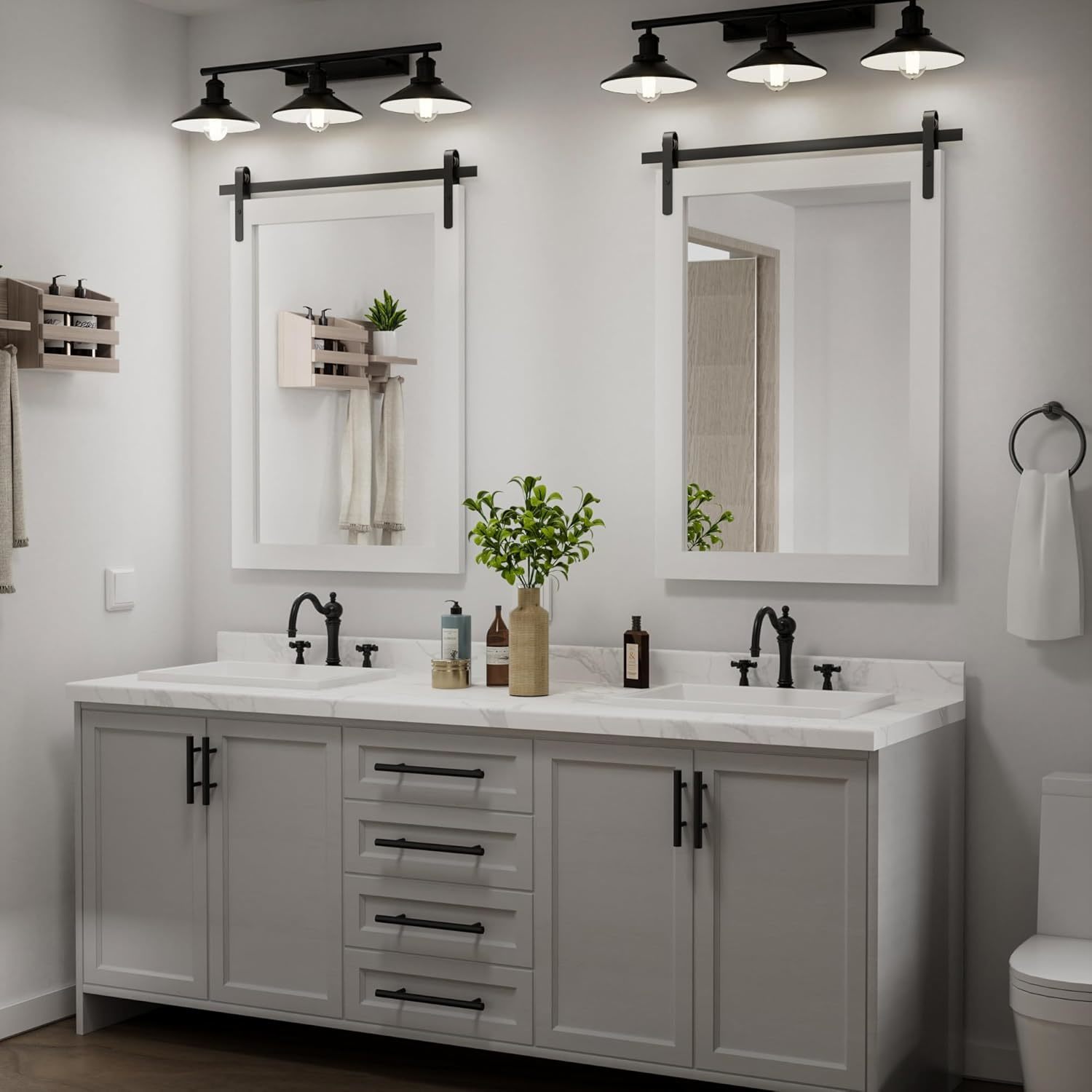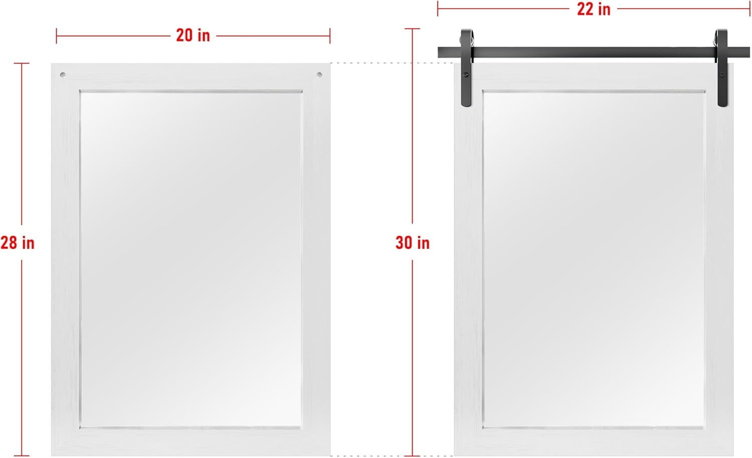?BARN DOOR TYPE MIRRORS?Our rustic farmhouse mirror outside frame size of 2230 inches (Including iron bracket hardware). ?EASY TO INSTALL?The mirror features a barn door-inspired design. The installation method of the metal bracket can be freely played according to personal preferences. ?WOOD FRAME?This barn door mirror is made of wood frame in rustic white. Heavy-duty metal bracket adds speciality to the mirror. ?DECORATIVE FUNCTION?If you are going for an Natural/Industrial/Retro/Contemporary look, you can use the mirror as a farmhouse style master bathroom mirror or as a decorative accent in a farmhouse-themed living space. ?STURDY PACKAGING?This barn door with mirror uses an extra-thick packing box to ensure safe shipment. If you have any questions after receiving the package, please feel free to contact us, and we will address your concerns or questions.