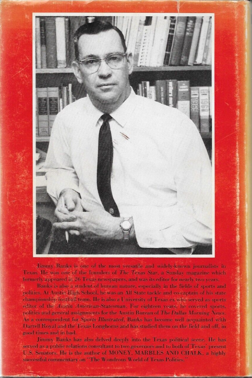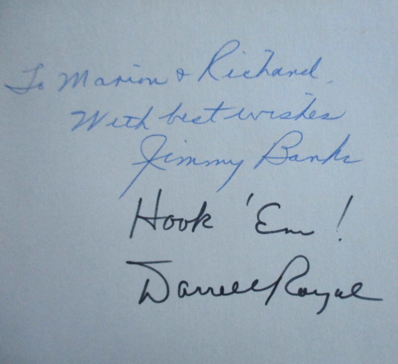 The book itself complete and in FINE or better condition with some overall light wear. The dustjacket is in GOOD - VERY GOOD condition with some overall wear that includes some rubbing, edge wear and small tears. The spine of the dustjacket is heavily sunfaded. On the front free endpaper, the author has inscribed, "To Marion Richard, With best wishes, Jimmy Banks". Underneath the inscription, Darrell Royal has signed, "Hook 'Em! Darrell Royal." (see pictures)