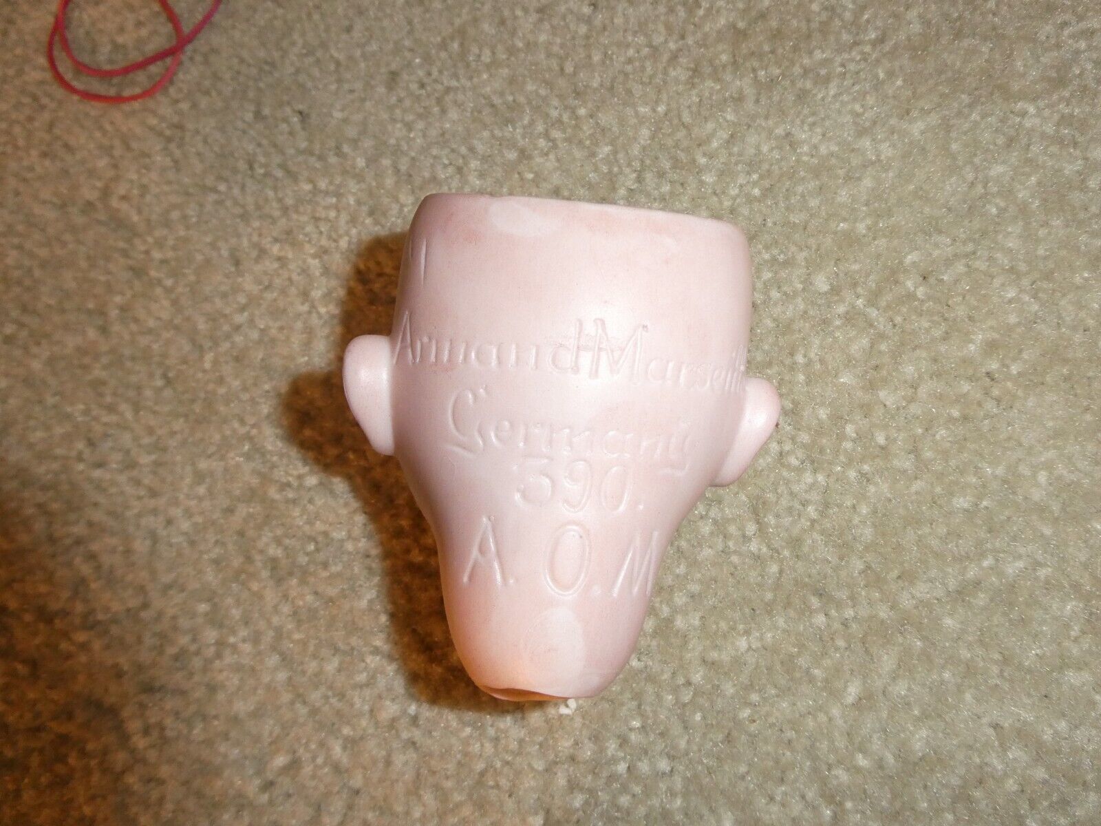 Very nice, circa 1930s era, bisque baby girl doll head marked Armand Marseille Germany 390 A0M on the neck as shown. 3 3/4 inches tall. Nice shape, small rim crack on the open dome edge, light wear around the open dome, no eyes, maybe could use a little fine cleaning. Zoom in for details.