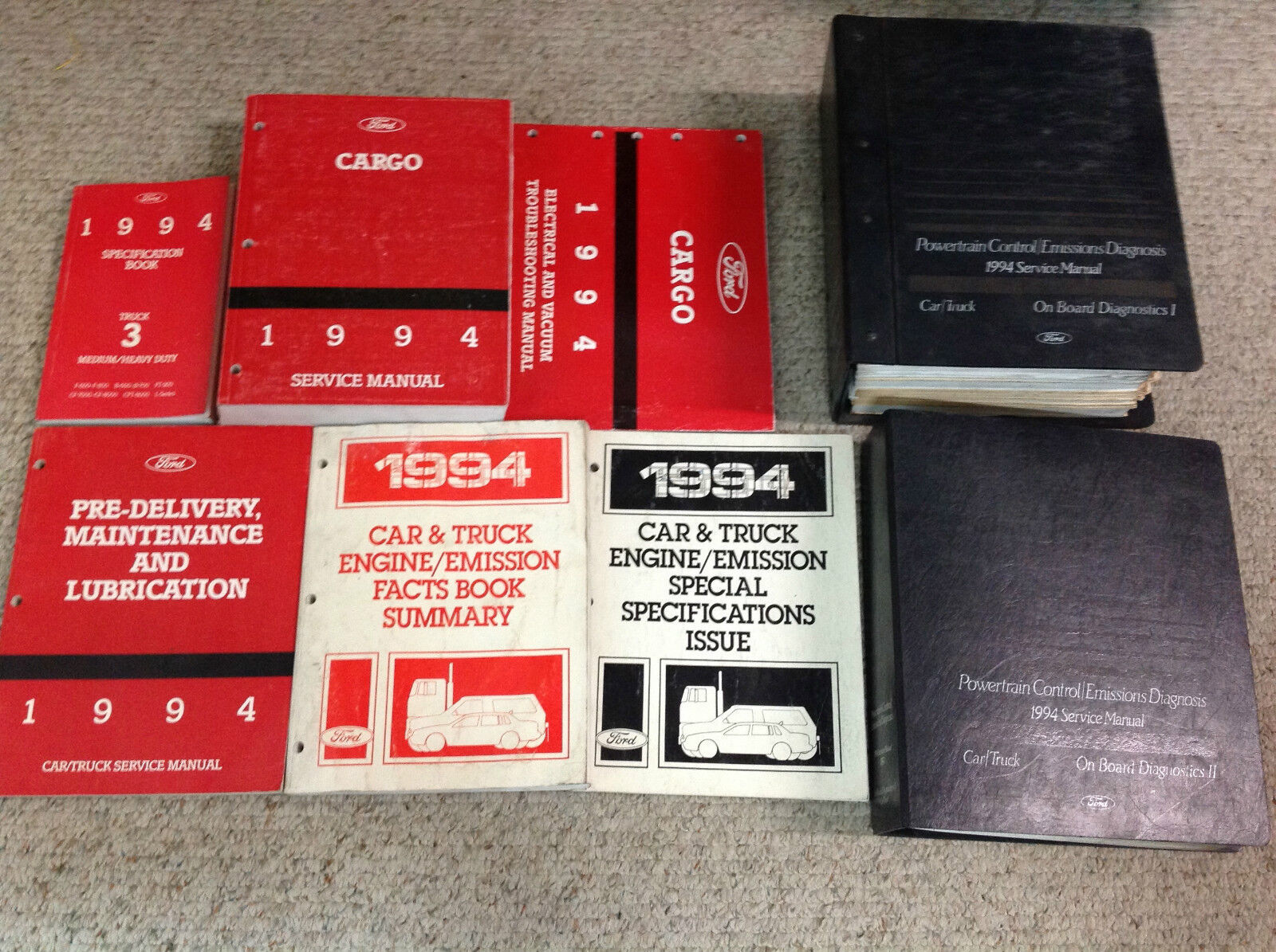Manuel d'entretien de l'usine Ford CARGO TRUCK 1994, manuel des schemas de cablage, manuel des specifications, manuels de diagnostic des emissions du groupe motopropulseur, manuel recapitulatif du livre de faits sur les emissions du moteur et manuel d'entretien et de lubrification avant livraison.