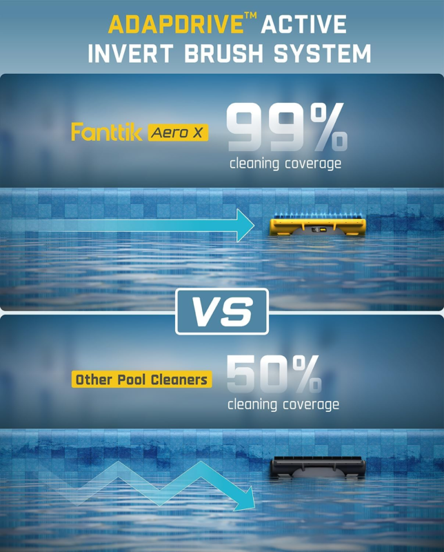 4x Cleaning Efficiency: The Aero X pool robot redefines cleaning speed. Its cleaning speed reaches up to 1076 sq ft/hr, and with the wider 15.7-inch rotating brush, it covers a larger area in the same amount of time, allowing your pool to quickly return to a clean state