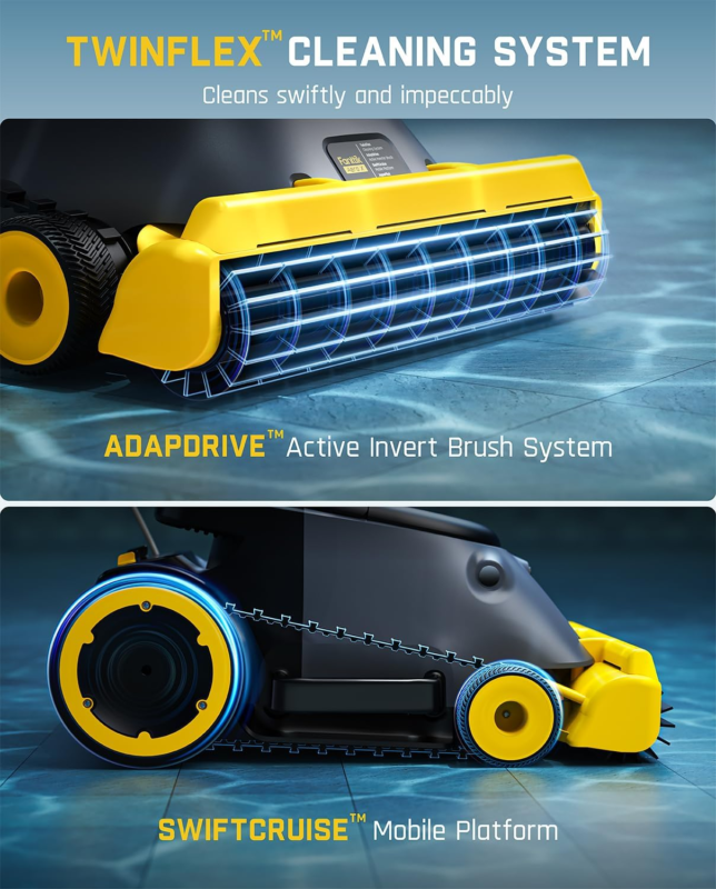 TwinFlex Cleaning System: The TwinFlex System is powered by the AdapDrive active invert brush system and the SwiftCruise mobile platform. The AdapDrive brush adjusts its rotation speed to target stubborn stains along pool edges and the waterline. Paired with the SwiftCruise flexible track, it delivers exceptional traction and adapts to various pool shapes and materials. Together, these components form the TwinFlex Cleaning System