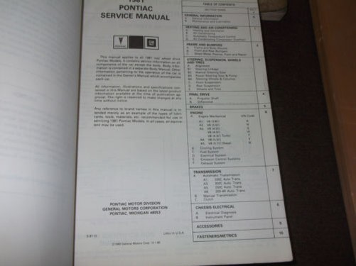 Manuel d'entretien d'usine Pontiac Firebird/Trans Am/Lemans/Grand Prix 1981