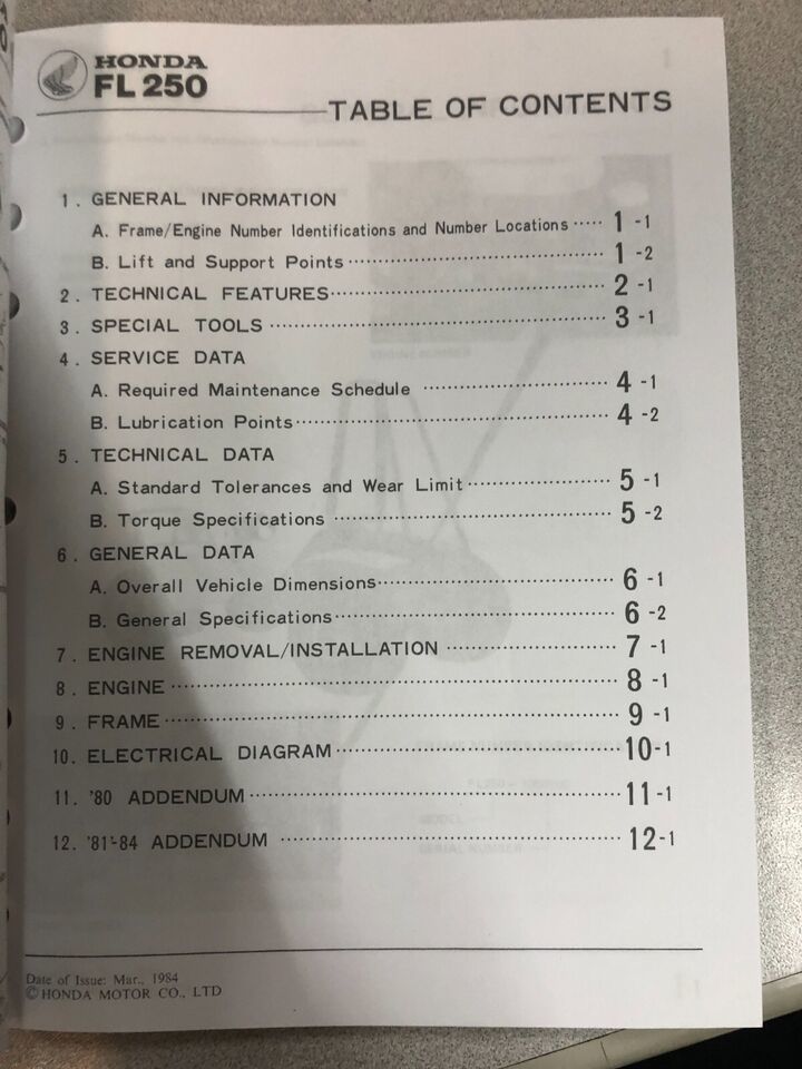 TOUT NEUF, 1977-1978-1979-1980-1981 HONDA ATV FL250 DEUXIEME MANUEL DE SERVICE D'IMPRESSION