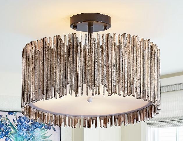 Display unique artistry with this 3-light semi-flush mount ceiling light. The black metal frame is complemented by a downward-facing wood drum shade. This semi flush mount ceiling light crafted of natural wood drum shade and metal hardware, is the unique blend of eclectic nautical and contemporary style. With a 3-light cluster in matte black, it illuminates the surroundings generously while casting captivating shadow patterns on ceilings in entryways, dining rooms, or bedrooms.