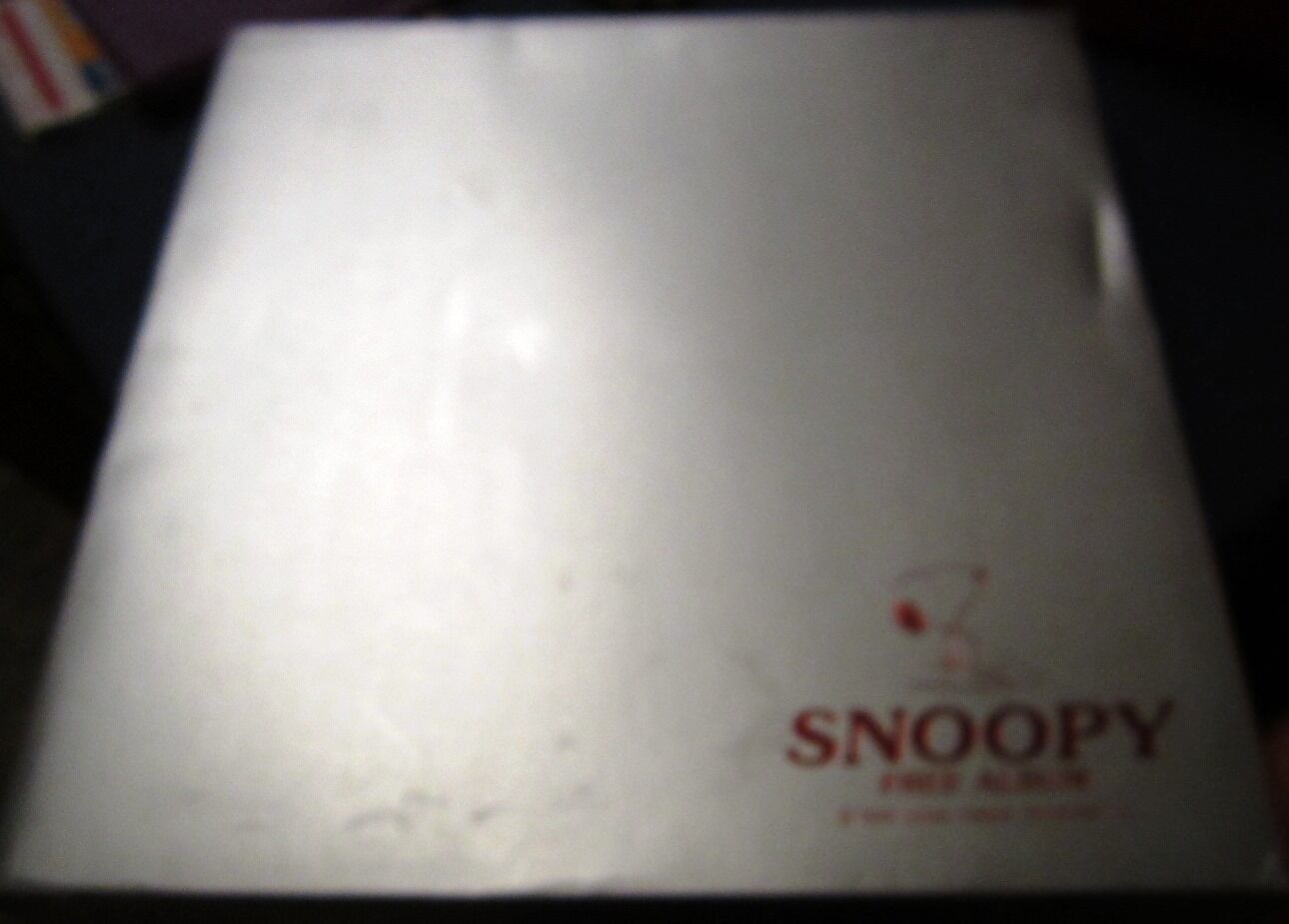 Silver box shows wear from storage. Snoopy on lower right corner of the box. Lower left corner of the box has some wear. (photo of full box is blurry.)