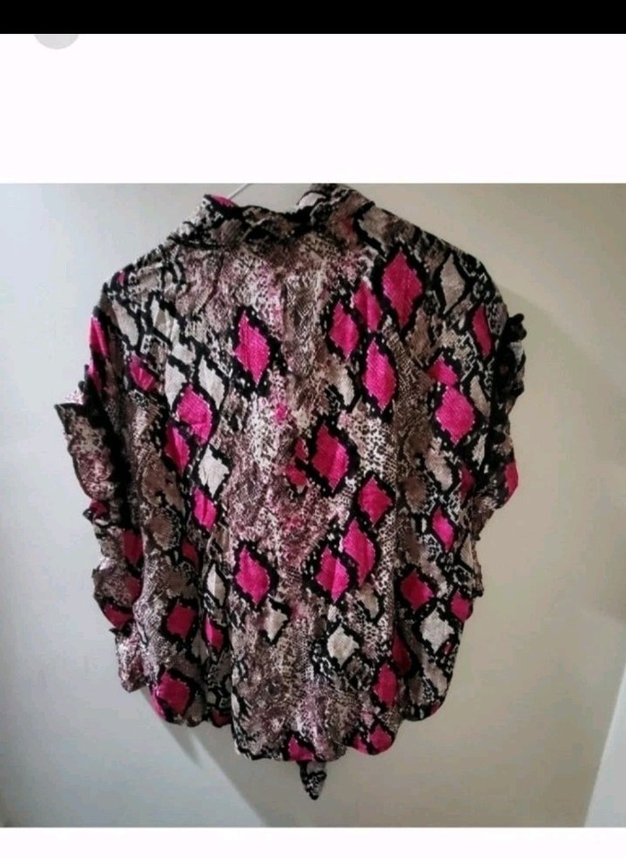 This blouse is still new with tag. It has a pretty print and a tie bottom design. 100% rayon pit to pit 19" length 24"
