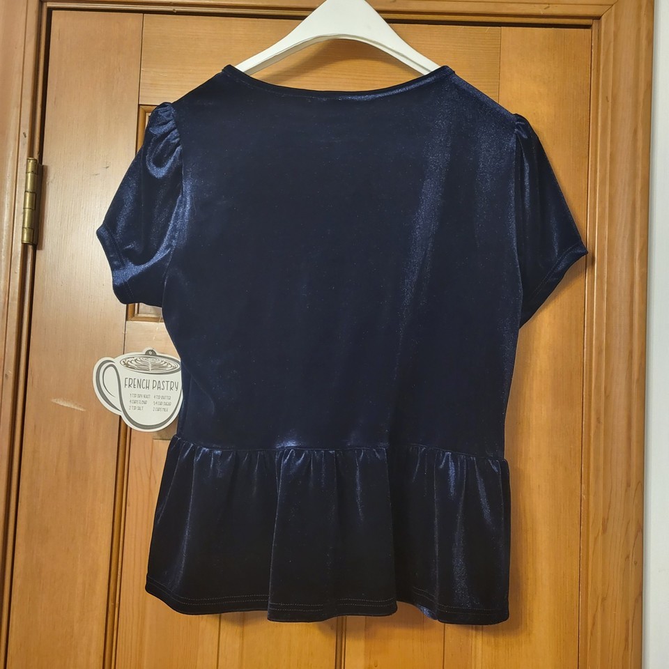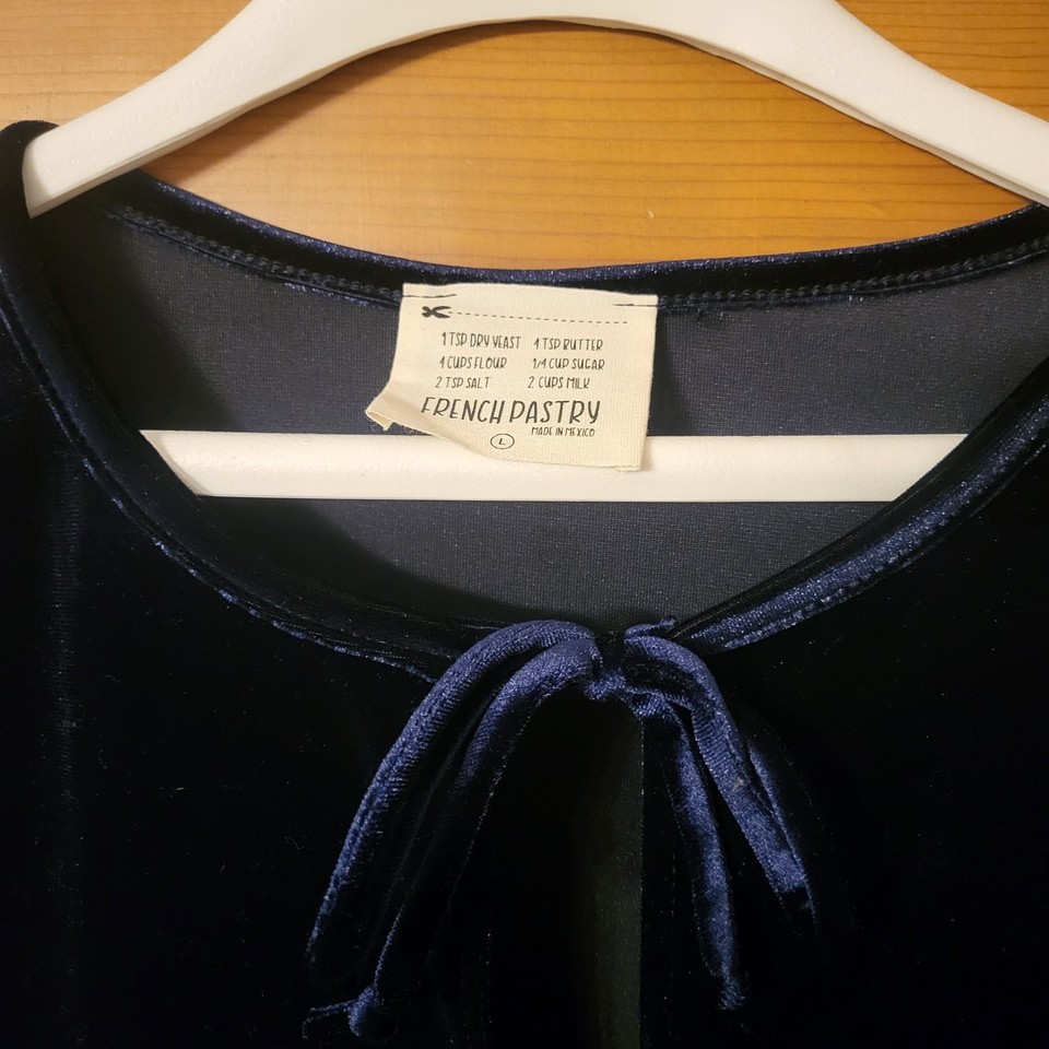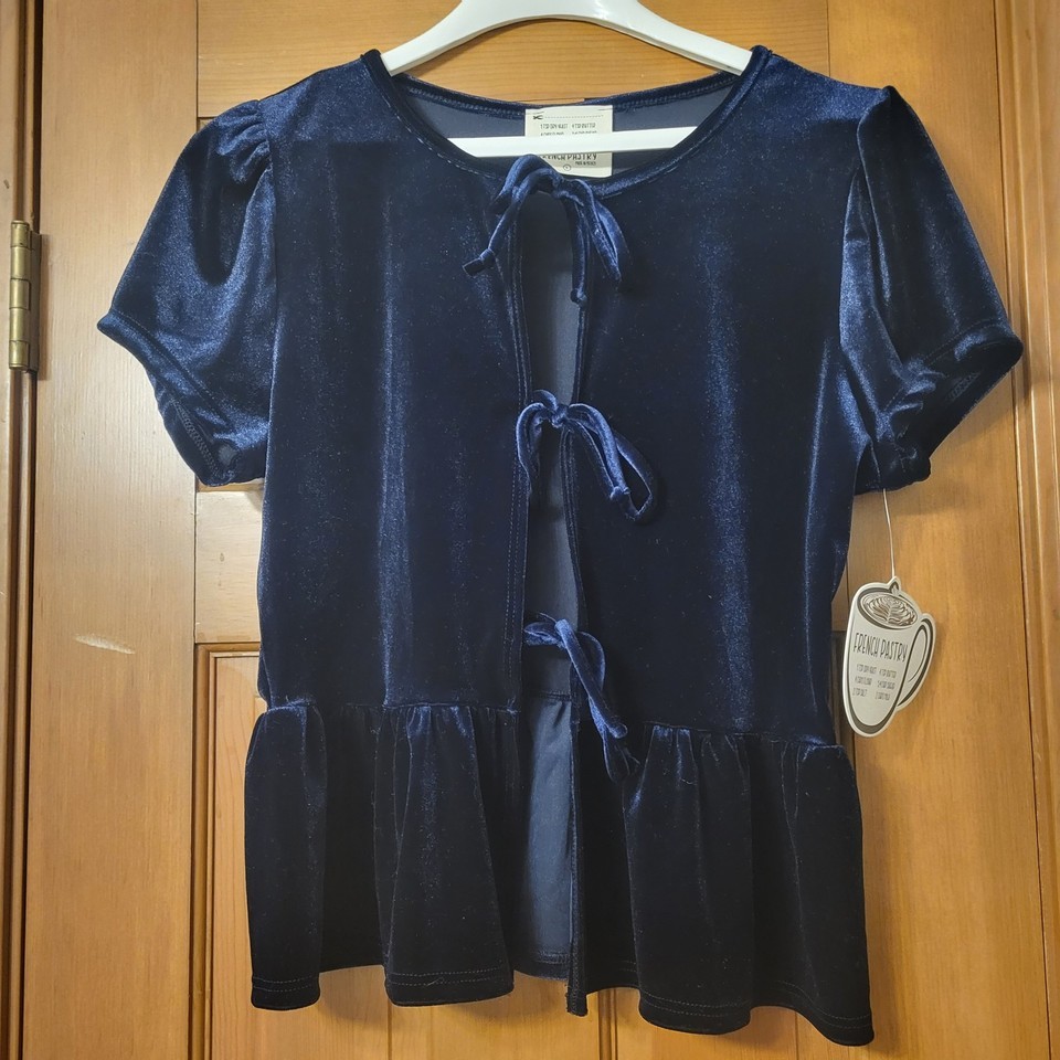 This navy blue open top is still new with tag! It has tie designs down the front and has a velour feel to it. Juniors size L