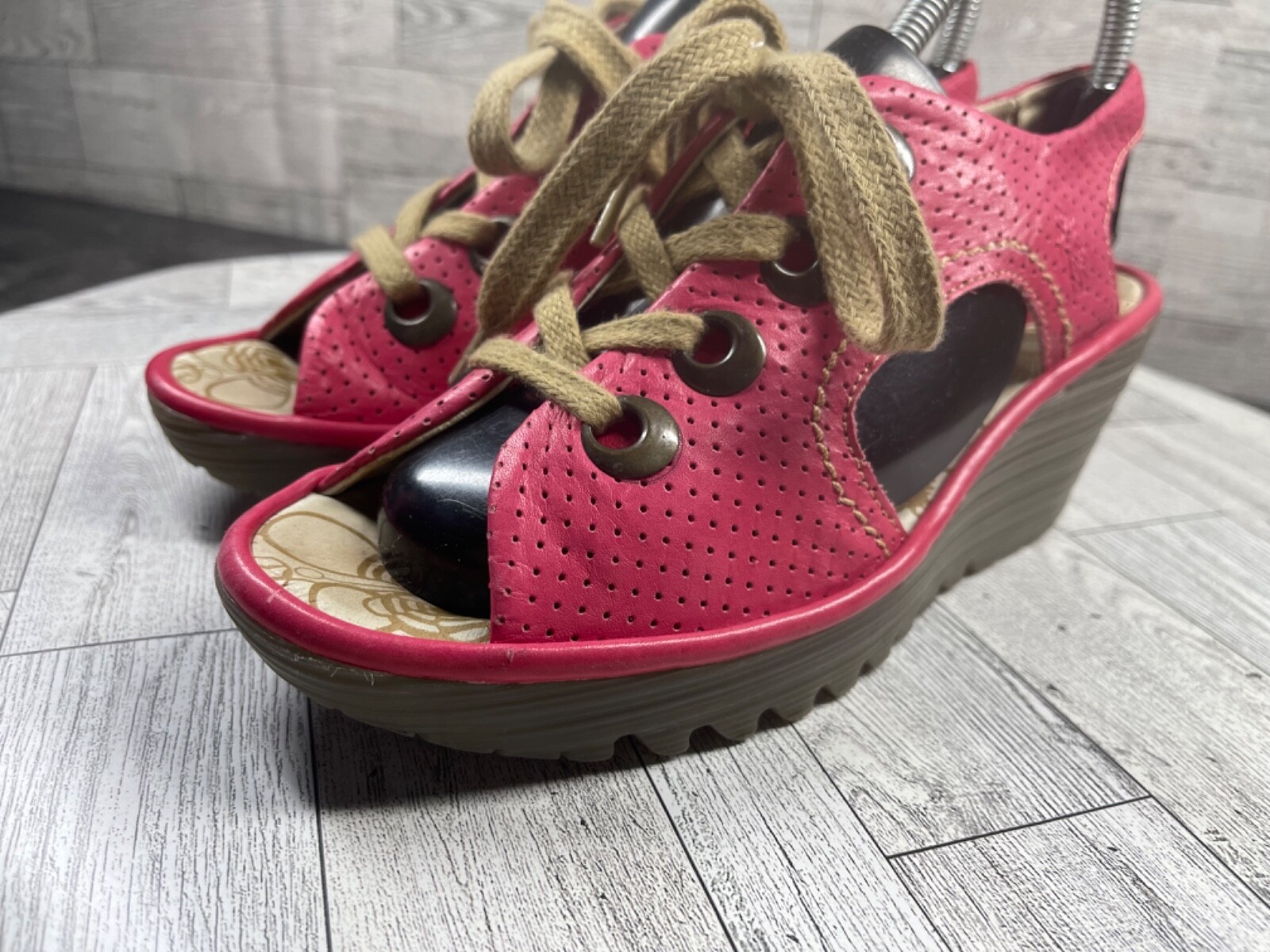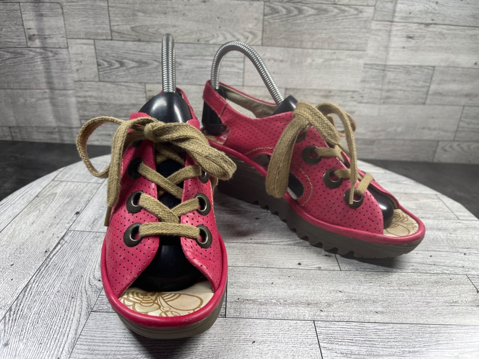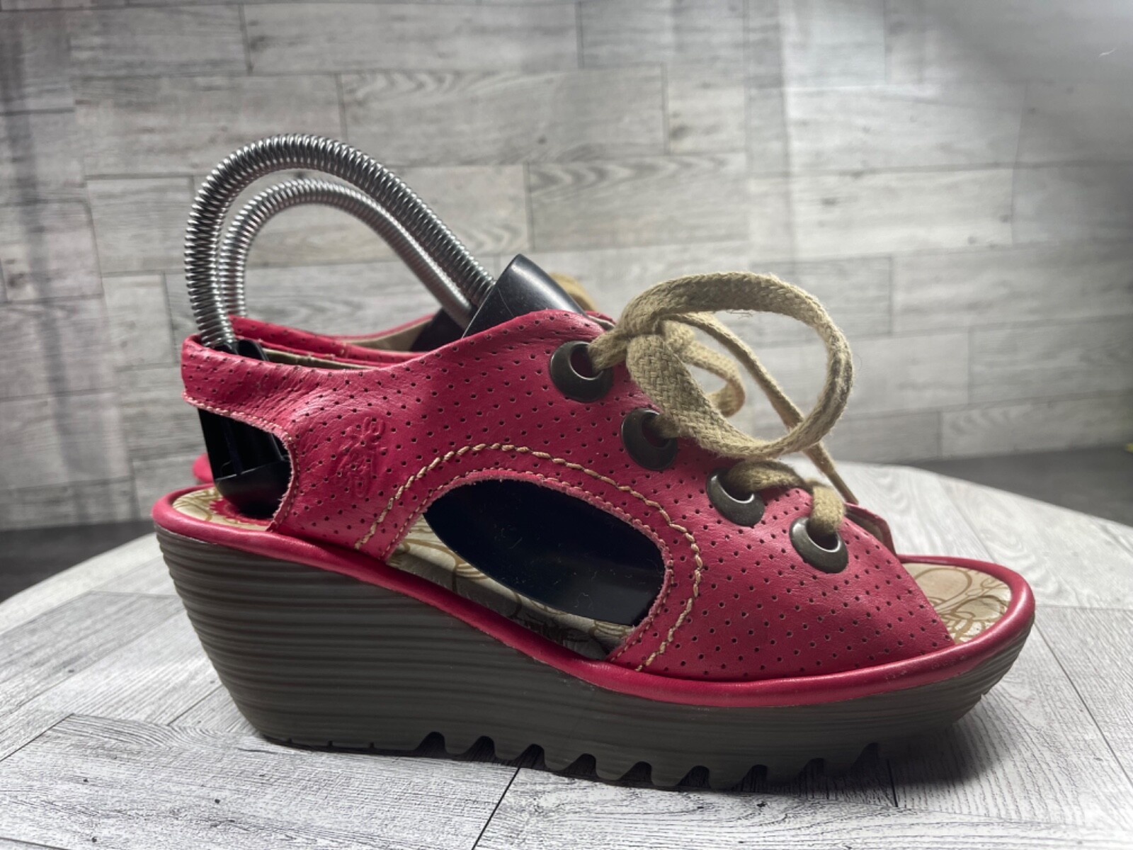 Fly London Sandals Women 7.5M Ylva Shoes Red Perforated Leather Wedge Lace Up