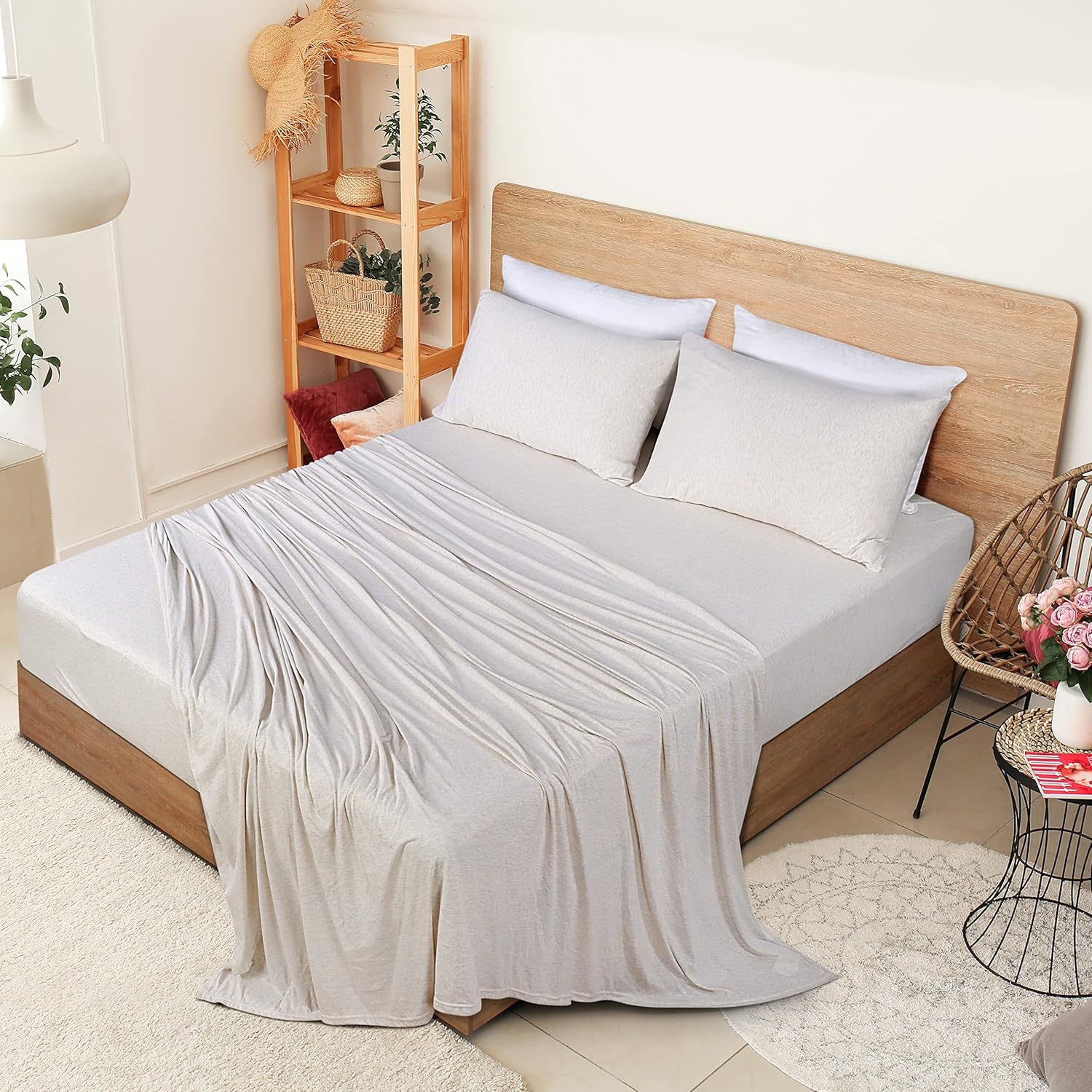 Cotton Blend Size Material: 4 pieces Jersey Sheet Set that includes a fitted sheet measuring 60 by 80 inches with a 15 inches deep pocket, a flat sheet measuring 90 by 102 inches and two pillowcases measuring 20 by 30 inches. The material is Cotton Blend meaning Cotton and Polyester Cozy And Comfortable: The Jersey Sheets are stretchy, soft, and cozy, just like your favorite T-shirt. You?ll feel extra comfortable while lying down on this jersey sheet and compelled to stay in bed for an extended amount of time. Suitable For All Seasons: Our Jersey Sheets are designed significantly for all seasons so that you can experience a pleasant sleep consistently. Attractive Color Range: This sheet comes in a variety of attractive and stylish color ranges to match it up with the overall and bedding and decor of your room. Easy Care: Machine wash in cold water; do not bleach; tumble dry or iron at normal temperature.