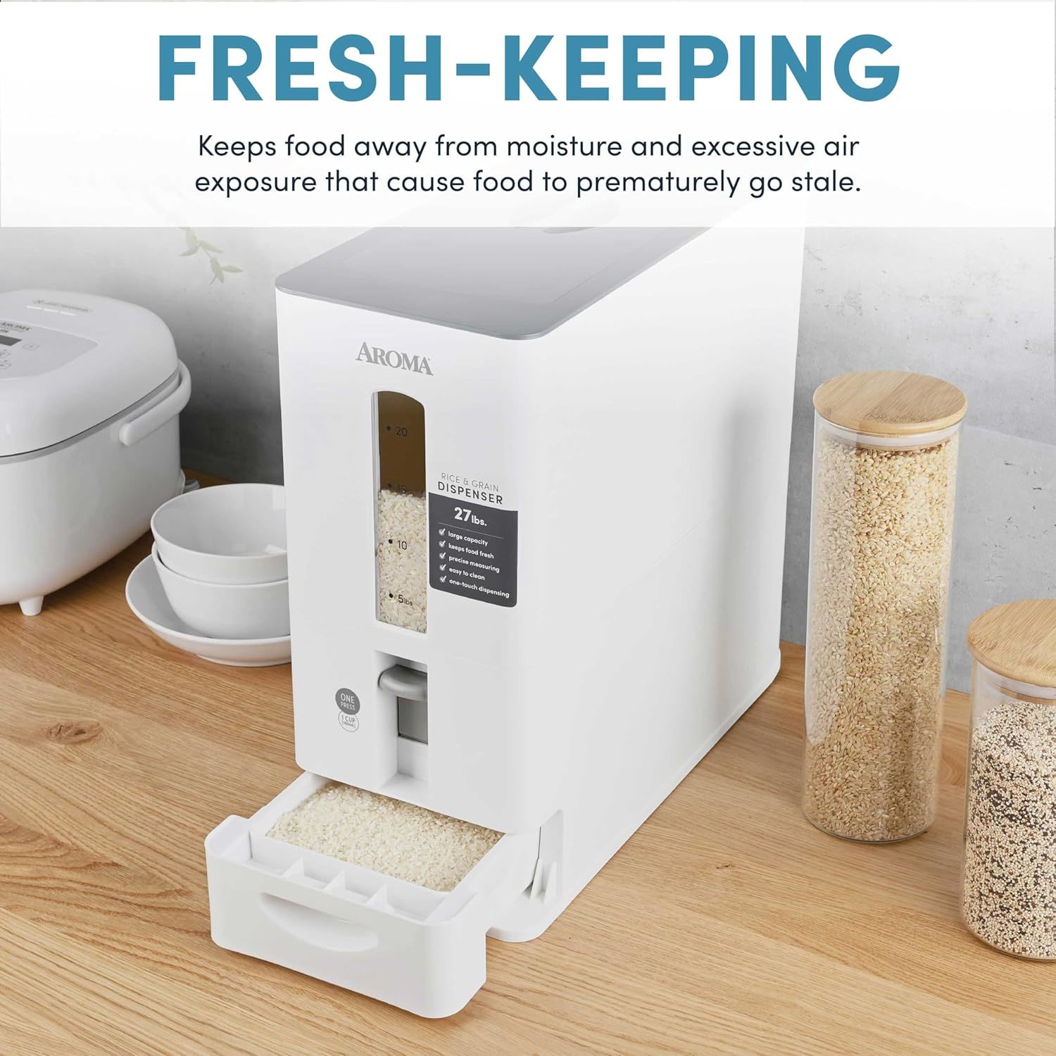 HUGE CAPACITY: Aroma?s rice dispensers are upgraded with even more storage and space-saving features; Now you can pour 27 pounds of rice or dried grains inside! AUTO MEASURING: Measure your rice cup with a single touch; This rice storage container automatically funnels 180ml into the dispensing drawer ? just push the lever. AIRTIGHT SEAL: Keep grains fresh for even longer; The sleek white dispenser is fitted with a sealed lid and dispenser drawer that keep moisture and stale air out. CONVENIENT REFILLS: With our upgraded, clear-view window and capacity lines, it?s easy to see when you?re running low; Simply lift the removable lid and pour rice inside. BUILT FOR LIFE: This rice storage bin is designed with hidden wheels; so you can easily roll it across your countertop; Plus, the grain dispenser is pretty enough to show off!