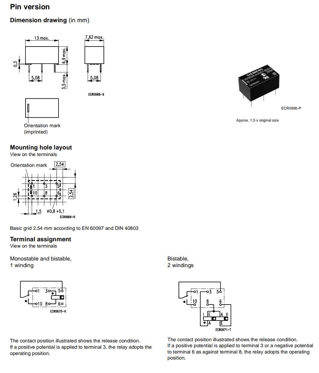 2PCS V23026-A1002-B201 Siemens Miniature PCB Relay P1 12VDC SPDT 1A 6-Pin PdNi