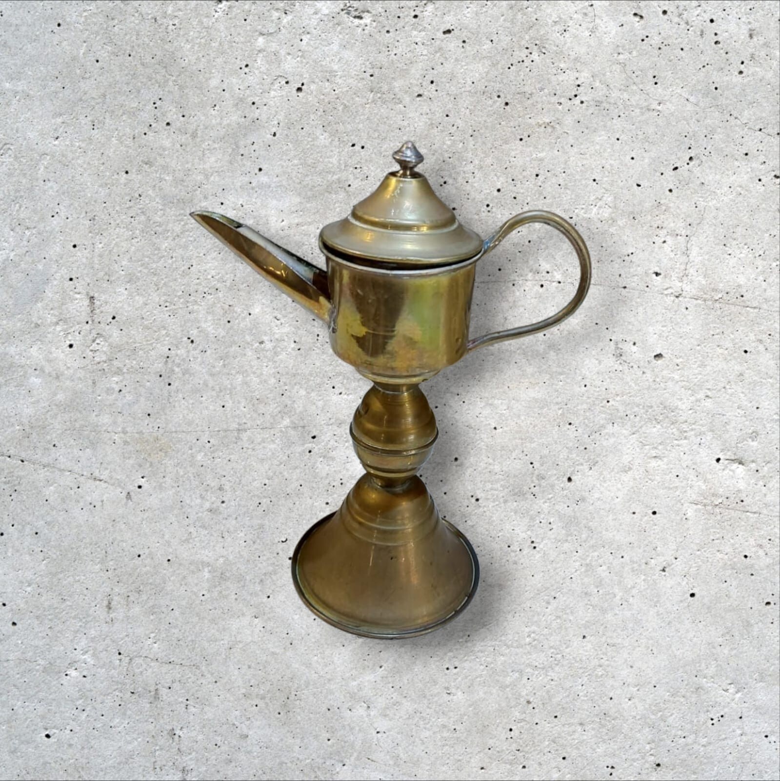With its wide base, the lamp is designed to prevent tipping over, ensuring stability when filled with oil. The top compartment holds the oil, while a wick is inserted through the spout part and lit to provide illumination.