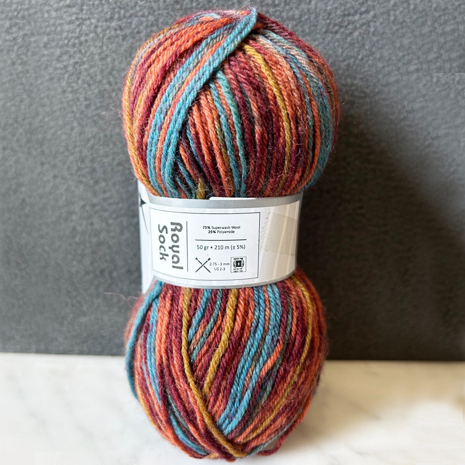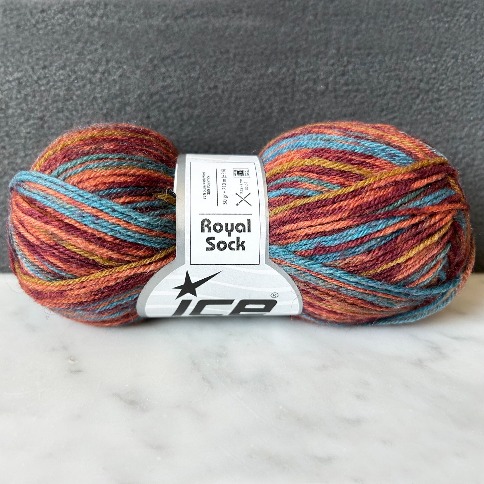One ball/skein of Ice Yarns Royal Socks yarn. Variegated colors: Orange, Brown, Green, Blue. 75% Superwash Wool, 25% Polyamide; machine wash and dry.