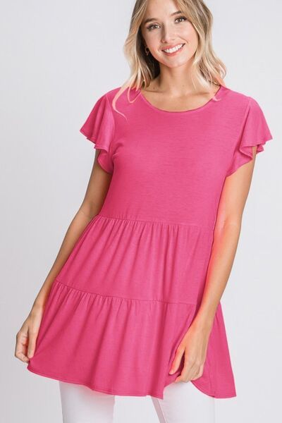 Heimish Full Size Tiered Round Neck Ruffle Sleeve Top Plus Size