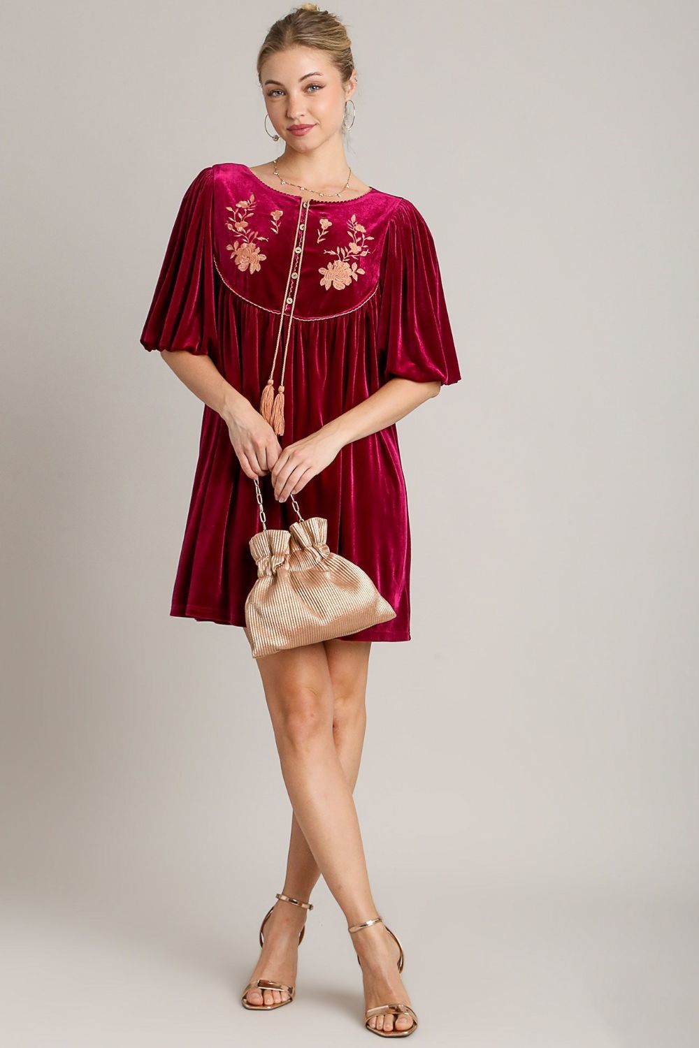Umgee Embroidered Half Sleeve Velvet Mini Dress with Tassel