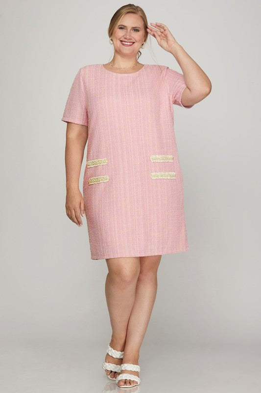 She + Sky Full Size Short Sleeve Pearl Studded Trim Knit Tweed Dress Plus Size