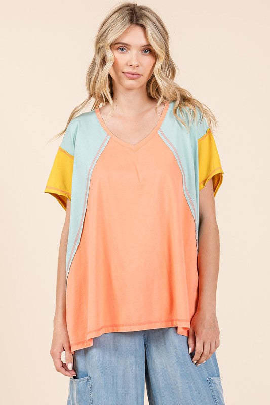 Mittoshop Color Block V-Neck Short Sleeve T-Shirt