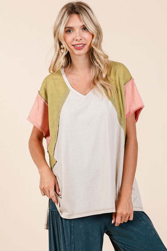 Mittoshop Color Block V-Neck Short Sleeve T-Shirt