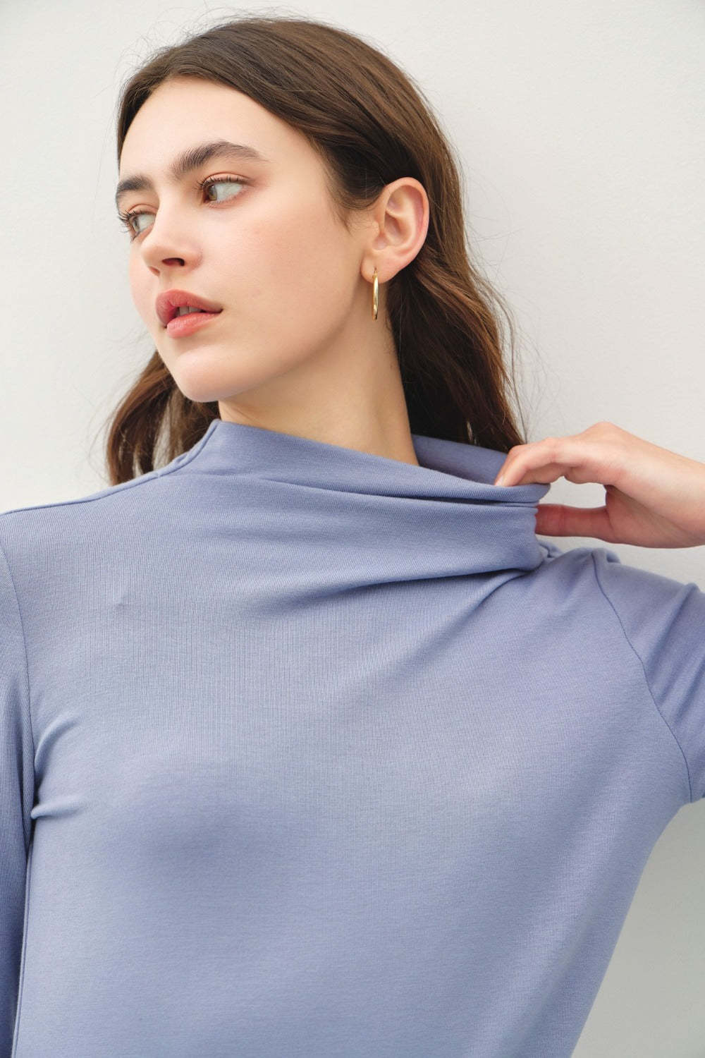 The Mock Neck Long Sleeve T-Shirt is a versatile and modern essential for any wardrobe. Featuring a stylish mock neck design and long sleeves, this t-shirt offers a chic and sophisticated look that can be easily dressed up or down. The soft and stretchy fabric provides a comfortable and flattering fit, making it a go-to piece for layering or wearing on its own. Whether paired with jeans for a casual ensemble or styled with trousers for a more polished outfit, this mock neck long sleeve t-shirt is a versatile and stylish option that effortlessly transitions from day to night. Add this piece to your collection for a touch of elevated simplicity in your everyday looks.