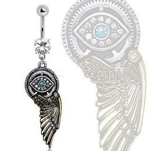 316L Gemmed Steampunk All Seeing Eye Navel Ring with Mechanical Wing Dangle A joint adventure of different styles this one-of-a-kind Navel Ring is a unique and fashion forward piece of body jewelry. Crafted out of high quality 316L Surgical Steel and polished to a mirror finish this belly ring starts with a Classic Barbell with a stunning prong-set faceted CZ gem. Sparkle leads to an intricately detailed Gear charm, decorated with a bejeweled all-seeing eye design in clear and striking blue gems. Affixed to this Steampunk dream is a lightly brass colored mechanical style wing, lightly brushed with antiquing, highlighting each metallic feather and fixture detail.