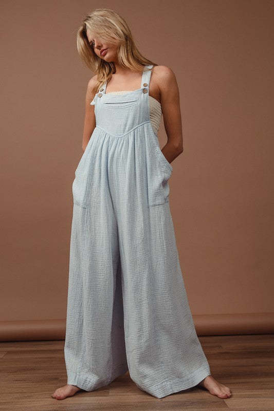 BiBi Vintage Washed Crinkle Gauze Wide Leg Overalls