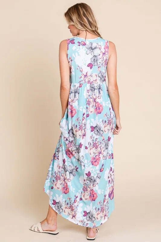BOMBOM Floral Round Neck Sleeveless Maxi Dress with Pockets