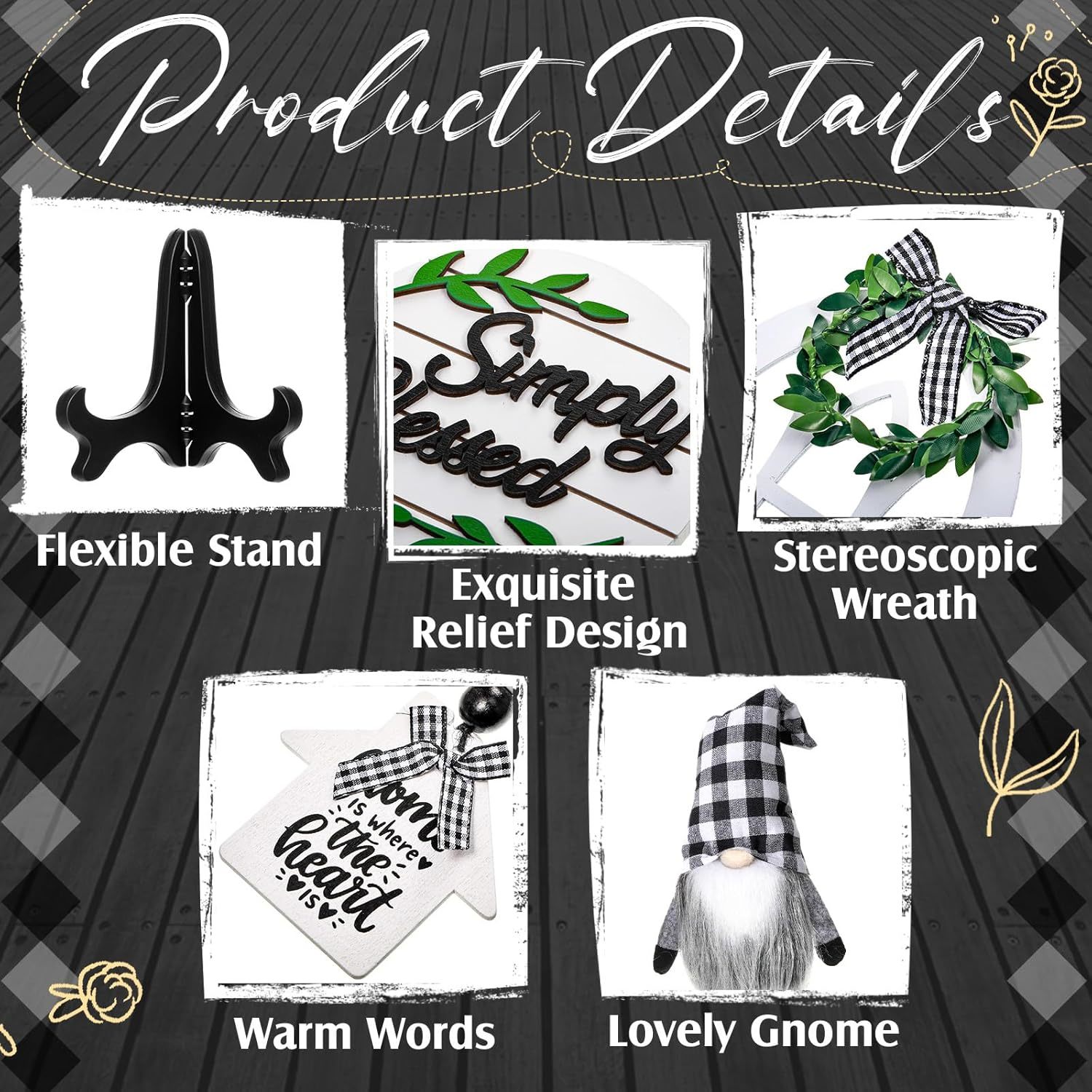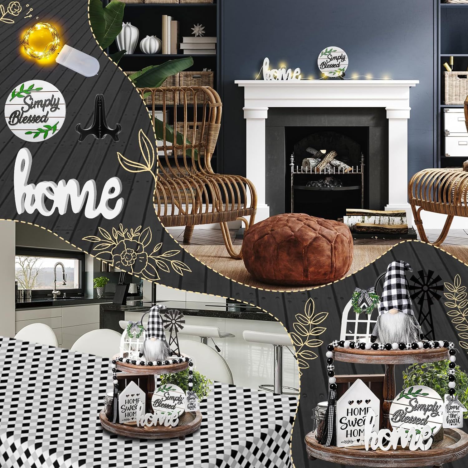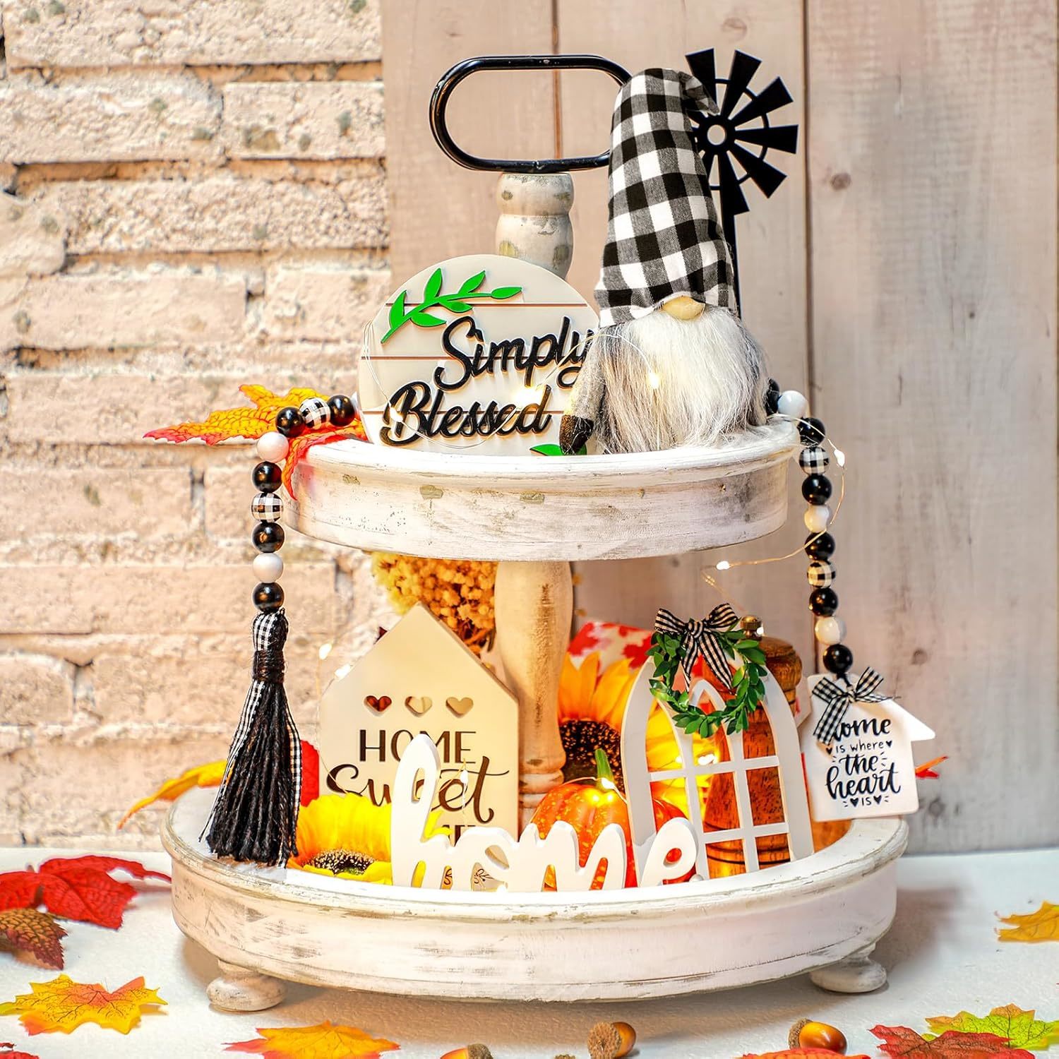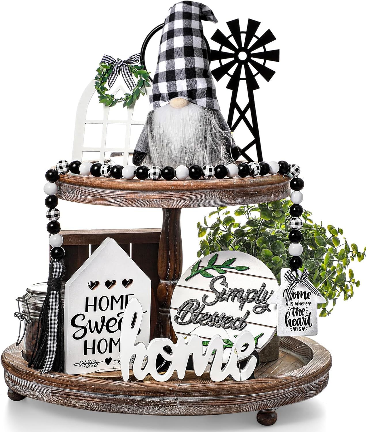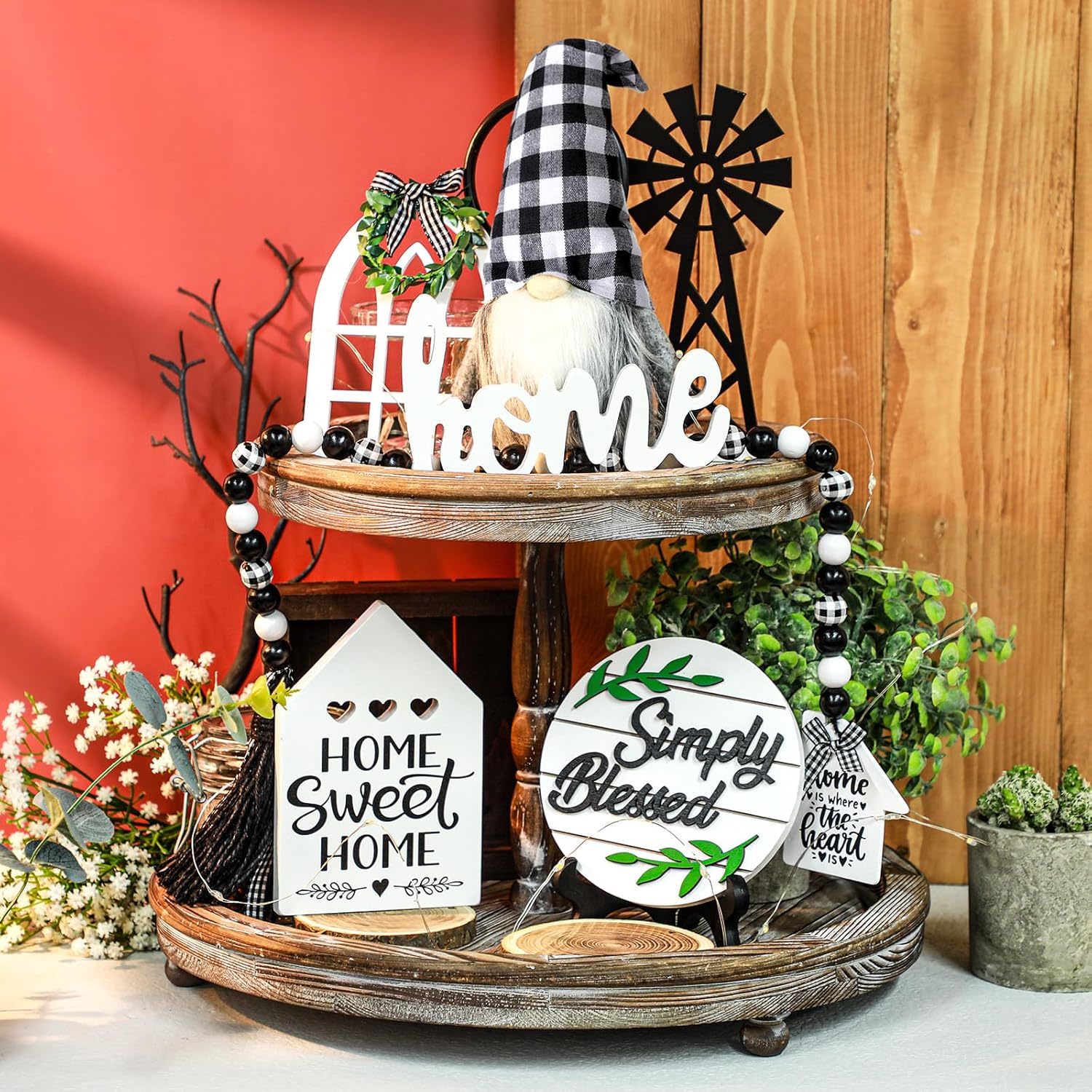 10 Pieces Farmhouse Decor Set: the package includes 5 pieces wooden signs, 1 piece black white buffalo plaid gnome, 1 piece wooden bead garland, 1 piece warm white LED string light and 2 pieces plastic stands, the stand can be applied to support simply blessed sign and farmhouse window sign, good combination set for decorating your living room, kitchen and bedroom; Please notice the tiered tray is not included Rustic Design: the farmhouse home decor set is designed with different patterns and words, adopting black white color and various shapes, showing you a rustic feeling, which can match your farmhouse, add a simple and rustic style to your space; Using these wooden signs with warm white LED lights will create a warm and rustic atmosphere at night, bring you good mood and happiness; Quality Material: the farmhouse sign and bead garland are made of quality boxwood, the patterns and words are clear and the surface is smooth, not easy to fade and break; The gnome is made of soft felt and fiber beard, delicate and sturdy; And the string light is made of copper wire, sturdy and strong, can be applied for a long time Wide Application: the rustic tiered tray decor set can be applied for your tiered trays, table, fireplaces, desks, dinner table, counter and more, it can create a warm home atmosphere, give you a simple and comfortable feeling Surprising Gift: the wooden home decor is a rustic and distinctive display, match well with most house style, especially for farmhouse, suitable as a special and surprising housewarming gift to your family, friends and neighbors