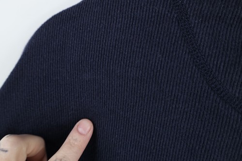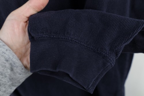Sun fade right arm. Blemishes throughout. Color faded. Pilling. Collar, cuffs discolored. Loose threads along seams