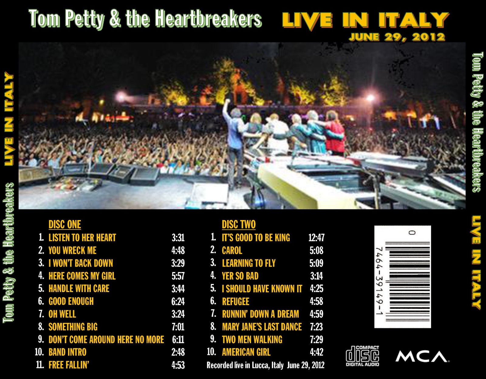 Classic two-hour concert from Tom Petty The Heartbreakers in Lucca, Italy, June 29, 2012. Excellent soundboard of incredible show. Professional-looking artwork, including disc art that is printed directly onto the disc, so this set looks and sounds fantastic. The music world lost one of its greats, but you can relive one of his magical nights on tour with this set.