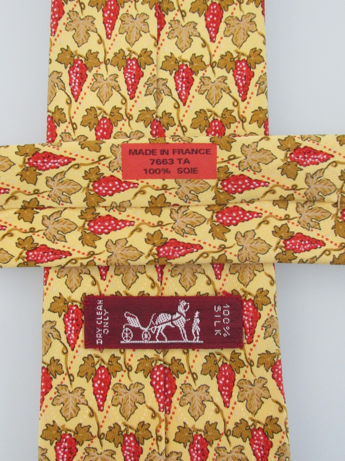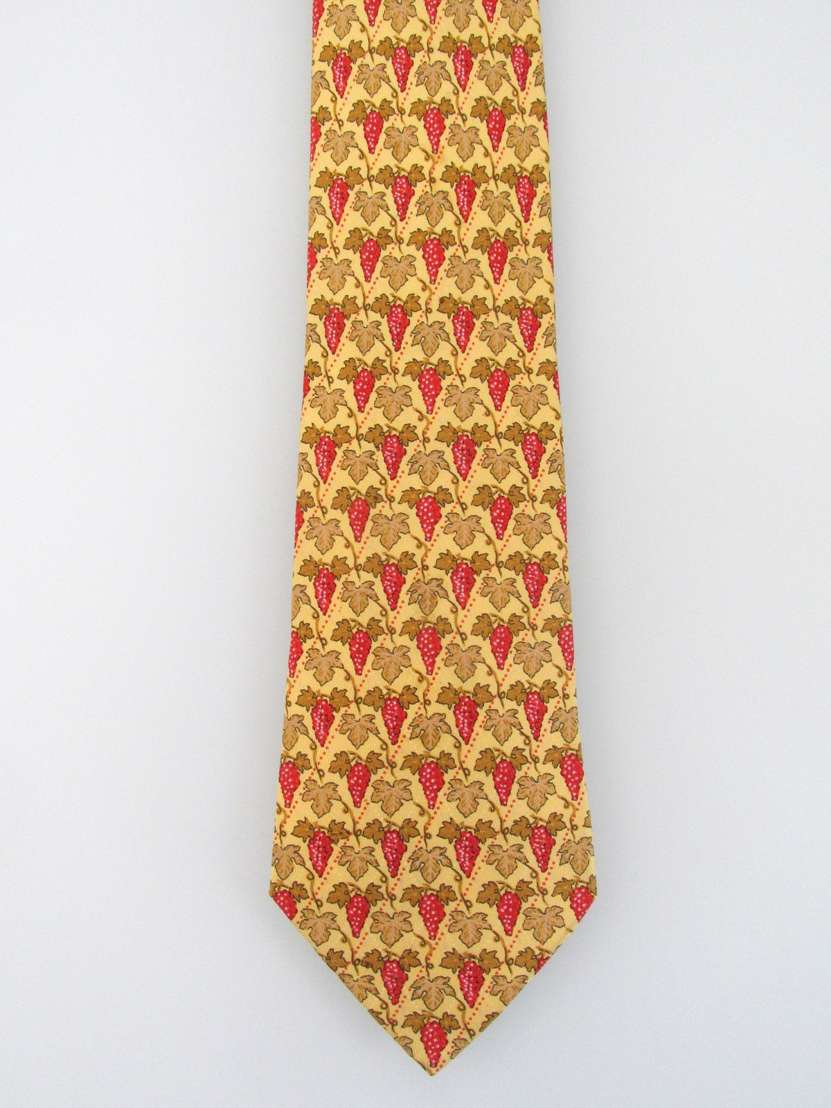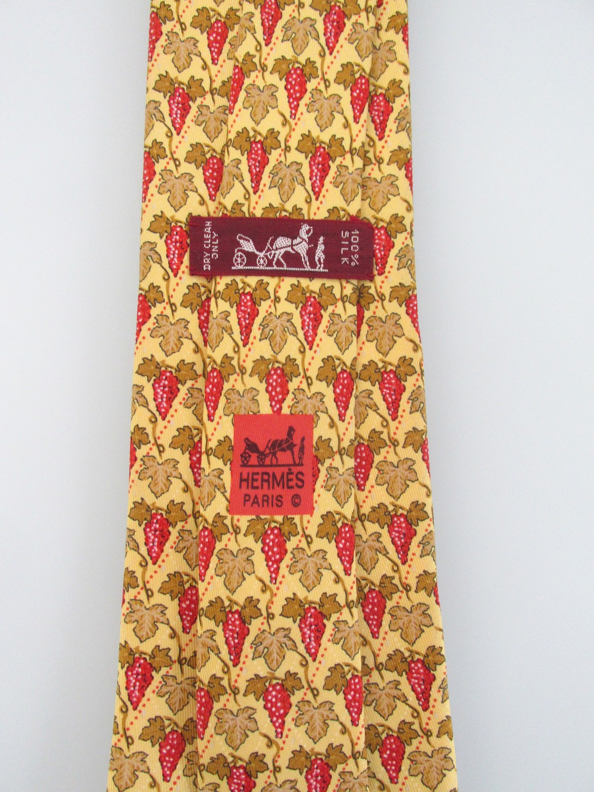 Description: Up for sale is a Hermes vintage men's silk tie. The print # is 7663TA. Hermes ties are handmade and hand-finished in France of the finest silk. Dimensions are approximately 56" long x 3.50" wide. The tie has a grape leaf motif in gold, red, white on a yellow background. This tie is in excellent condition.
