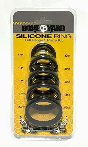 These must-have man toys are designed with superior materials and production thus increasing both comfort and lifespan. The powerful and iconic boneyard-branded design has a sleek soft touch silicone finish and features a superior and durable 3x-stretch. The medical grade 100 percent silicone rings and non-roll design provide a snug fit that both the wearer and his playmates will appreciate. Unique to themselves, these rings synergize with the wearer, providing endless comfort when wearing under your jeans. Ideal for stacking and perfect for stores to ensure customer does indeed obtain the correct size. You can be assured that they will withstand the punishment of your longest play sessions time and time again. The rings are packaged in a full-range 5 set kit for custom adjusting. Sizes are 1.2 inch, 1.4 inch 1.6 inch, 1.8 inch and 2.0 inch. They are also sold individually for multiple uses.