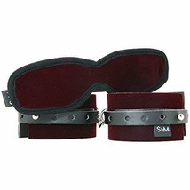 Sex and Mischief Enchanted Kit. This burgundy blindfold with a full coverage shape and velvet feel and single elastic strap and set of cuffs is not intimidating for the person new to fantasy play making them a great purchase for beginners. And they are stylish too! These inexpensive, lightweight, and accessible restraints are great if you are looking to experiment in light bondage. A fantastic addition to your fantasy or sensation play toy box. Product specifications: beginners wrist cuffs for first time bondage fun. Materials: polyurethane, acrylic, polyester, polyurethane foam, elastic, nickel free metal. Includes: one pair of adjustable 9 inches handcuffs with stud closure and single clasp connection and one 9 inches blindfold. For added fantasy fun add a leash and take your lover wherever you want to go. With the blindfold on your partner, introduce some sensation play with a feather or tickler.