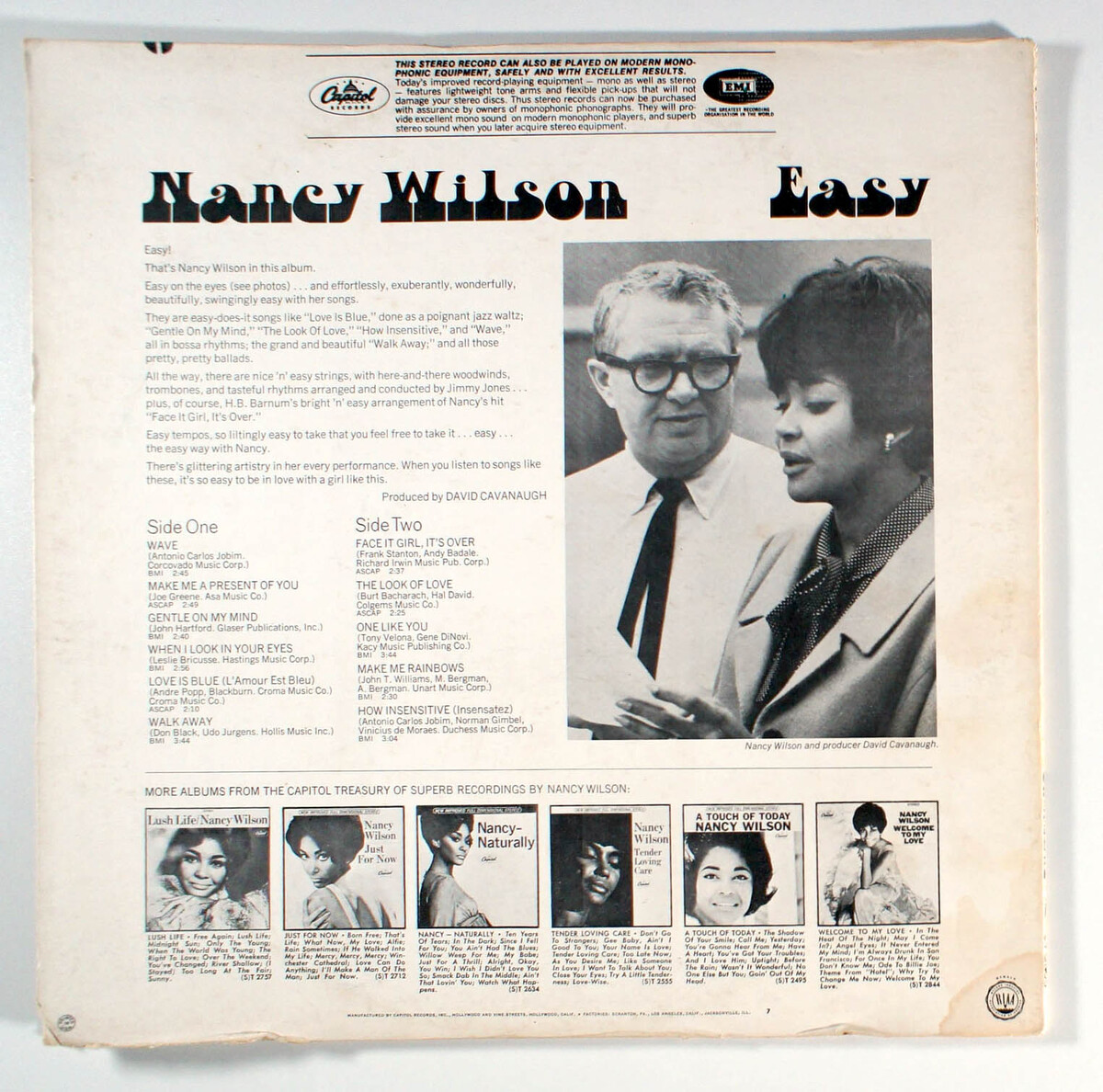 Easy, by Nancy Wilson, features arrangements by Jimmy Jones and production by David Cavanaugh. Allmusic praises Wilsons "sultry and assured delivery", highlighting standout tracks like the dramatic Gentle on My Mind and the single Face It Girl, Its Over, though criticizes the lackluster charts by Jones. The album includes opening and closing tracks composed by Antnio Carlos Jobim, adding a bossa nova flair. It reached No. 5 on the Hot R B LPs chart and No. 51 on the Billboard 200, with the single Face It Girl, Its Over peaking at No. 15 on the Hot Rhythm Blues Singles chart and No. 29 on the Billboard Hot 100.