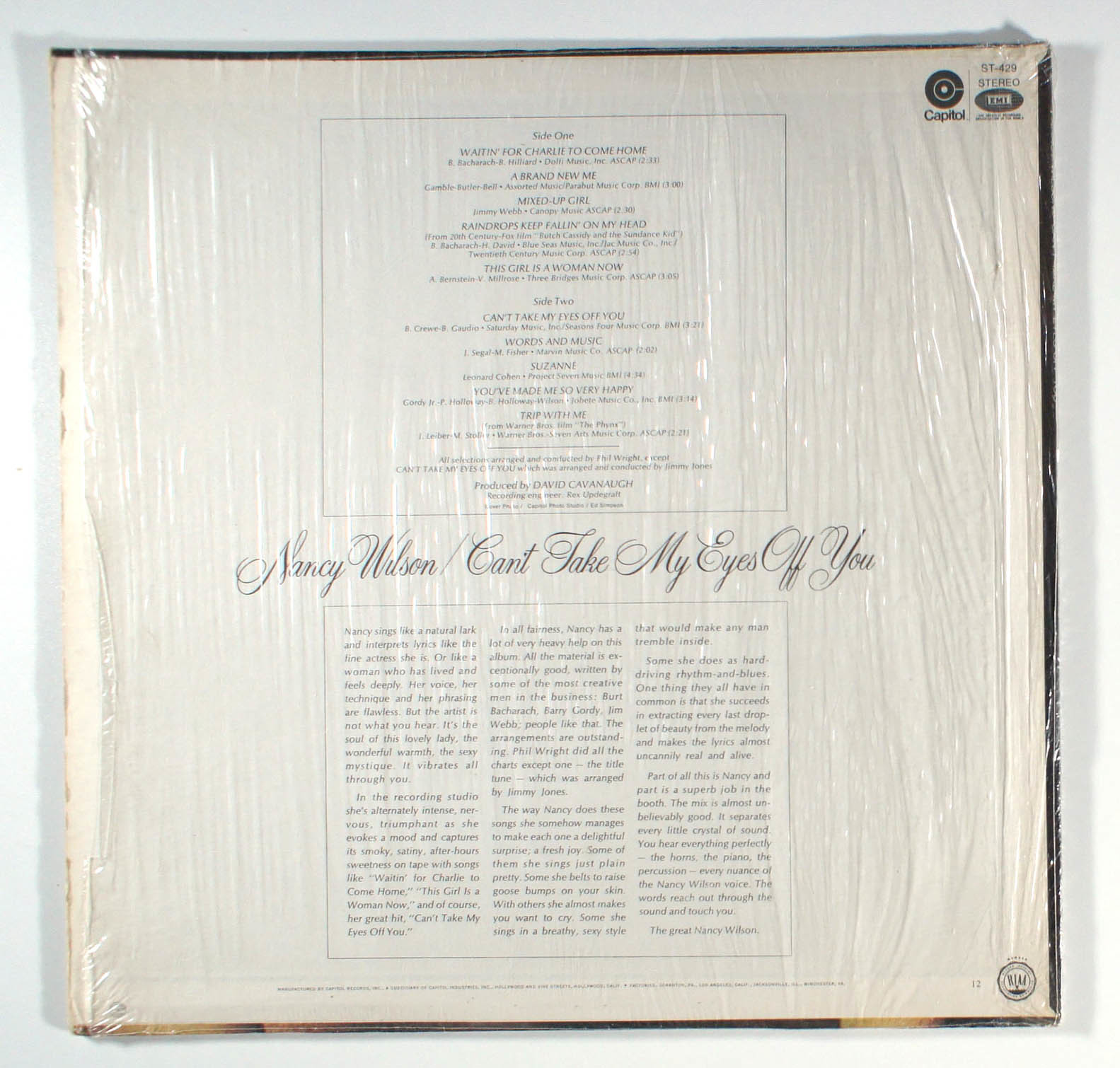 Can't Take My Eyes Off You, by Nancy Wilson, showcased her transition from a jazz ingenue to a soulful interpreter of contemporary songs. Produced by David Cavanaugh with arrangements by Phil Wright and Jimmy Jones, the album features a mix of covers by composers like Bacharach and David, Leonard Cohen, and Jimmy Webb, earning praise from Record World as a "bright and warm outing" for the versatile artist. The title track, originally from her 1969 album Hurt So Bad, became so popular on radio that it inspired the album?s name and anchored its success. The album includes notable tracks like Waitin' For Charlie To Come Home and songs popularized by Dusty Springfield and Blood, Sweat Tears, blending jazz, pop, and soul elements. It entered the Billboard 200 on March 28, 1970, reflecting Wilson?s appeal to a new generation of listeners despite limited promotion from Capitol Records.