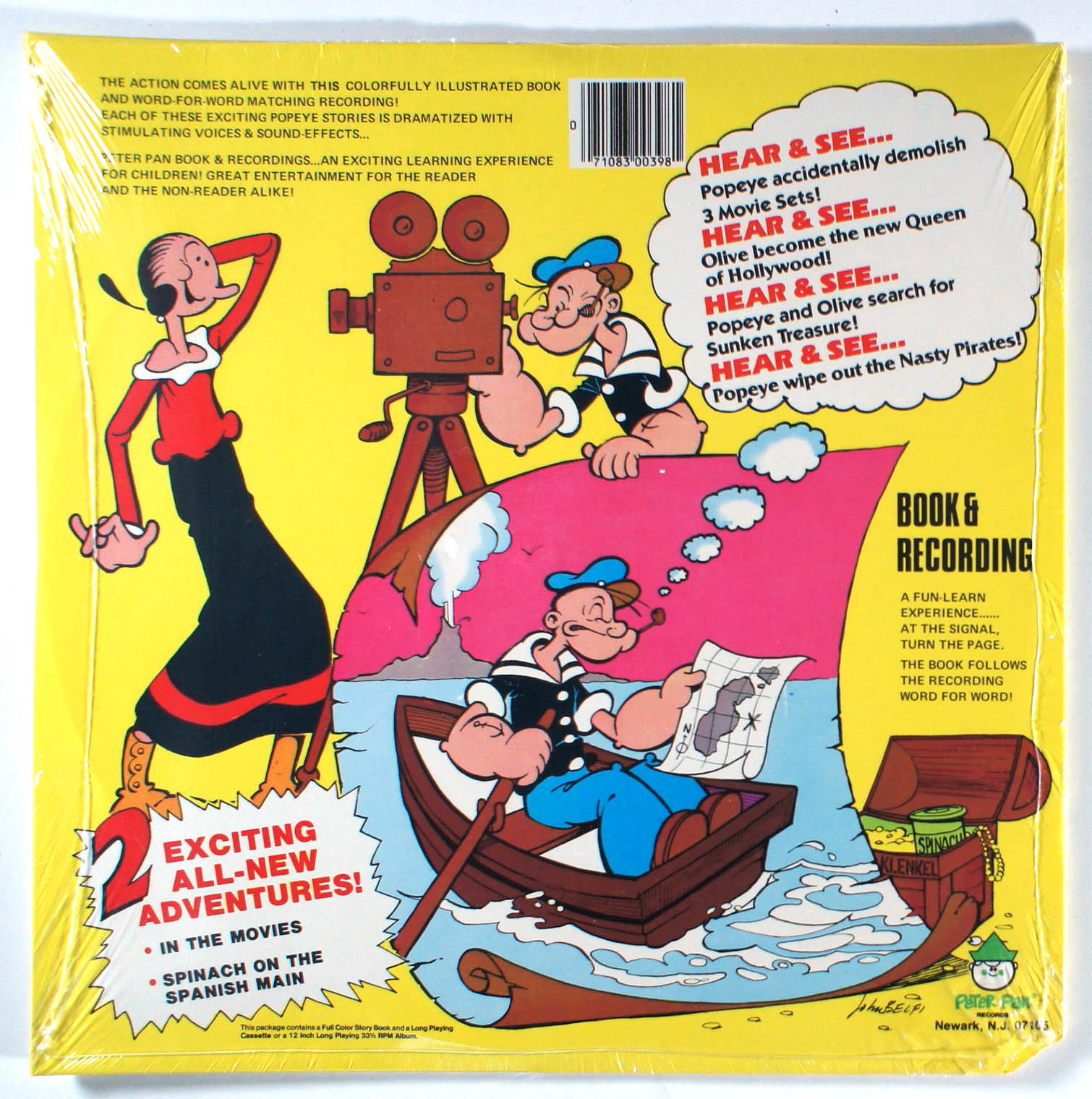 Popeye The Sailor Man: In the Movies Spinach on the Spanish Main features two exciting all-new adventures! The action comes alive with this colorfully illustrated book and word-for-word matching record. Each of these exciting Popeye stories is dramatized with stimulating voices, including Jack Mercer as Popeye, and sound-effects. This is an exciting learning experience for children! Great entertainment for the reader and the non-reader alike! Hear and see: Popeye accidentally demolish three movie sets; Olive Oil become the new Queen of Hollywood; Popeye and Olive search for sunken treasure; Popeye wipe out the Nasty Pirates!