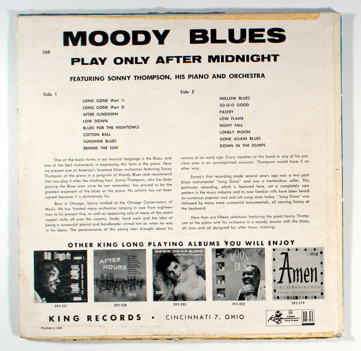 Moody Blues (Play Only After Midnight), by Sonny Thompson, is a collection of instrumental R B and blues tracks tailored for late-night listening. It features tracks like Long Gone (Pt. 1 2), After Sundown, and Blues For The Night Owls, showcasing Thompsons smooth piano work and moody, atmospheric arrangements. The album, recorded in mono, captures the essence of 1950s R B with contributions from saxophonists like Eddie Chamblee and David Bubba Brooks. Its evocative titles and mellow vibe make it a fitting soundtrack for introspective or relaxed settings. The LP remains a rare gem, celebrated by collectors for its historical significance in Thompsons discography.