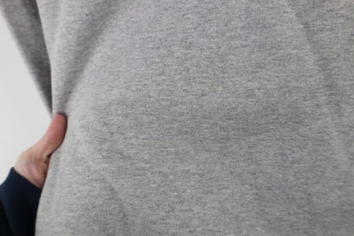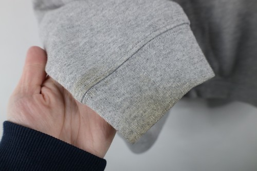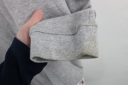 Stains arms/cuffs. Dark spots front. Collar, cuffs discolored. Loose thread front bottom. Graphics, color faded. Pilling. USA made
