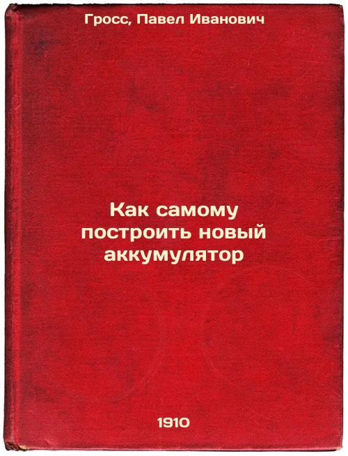 Short description: In Russian. Gross, Pavel Ivanovich. How to build a new battery yourself: St. Petersburg: A.F. Sukhova, 1910. Kak samomu postroit' novyy akkumulyator. In Russian /How to build a new battery yourself. The image is provided for reference only. It may reflect condition of one of the available copies or only help in identifying the edition. Please feel free to contact us for a detailed description of the copies available. SKU3767092