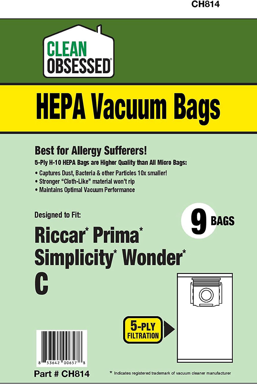 H-10 HEPA Bags Fits Riccar Prima and Simplicity Wonder Type C (9 Bag Pack)