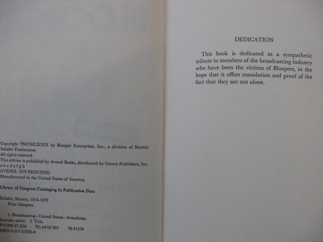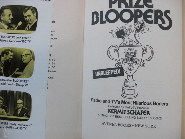 Prize Bloopers, Radio and TV’s Most Hilarious Boners, collected by Radio-TV Producer, Kermit Schafer, C. 1979, published by Avenel Books, New York.
