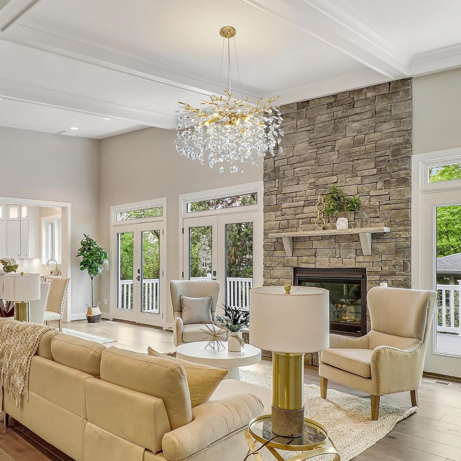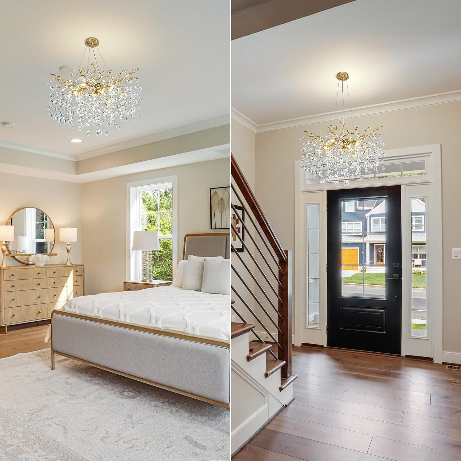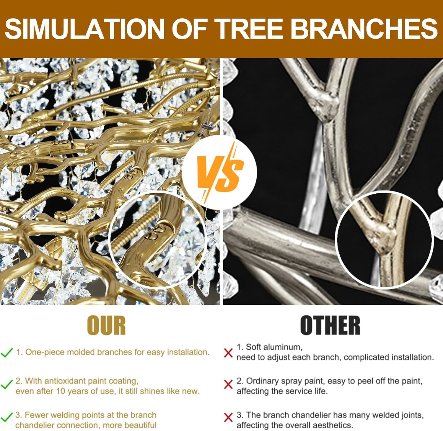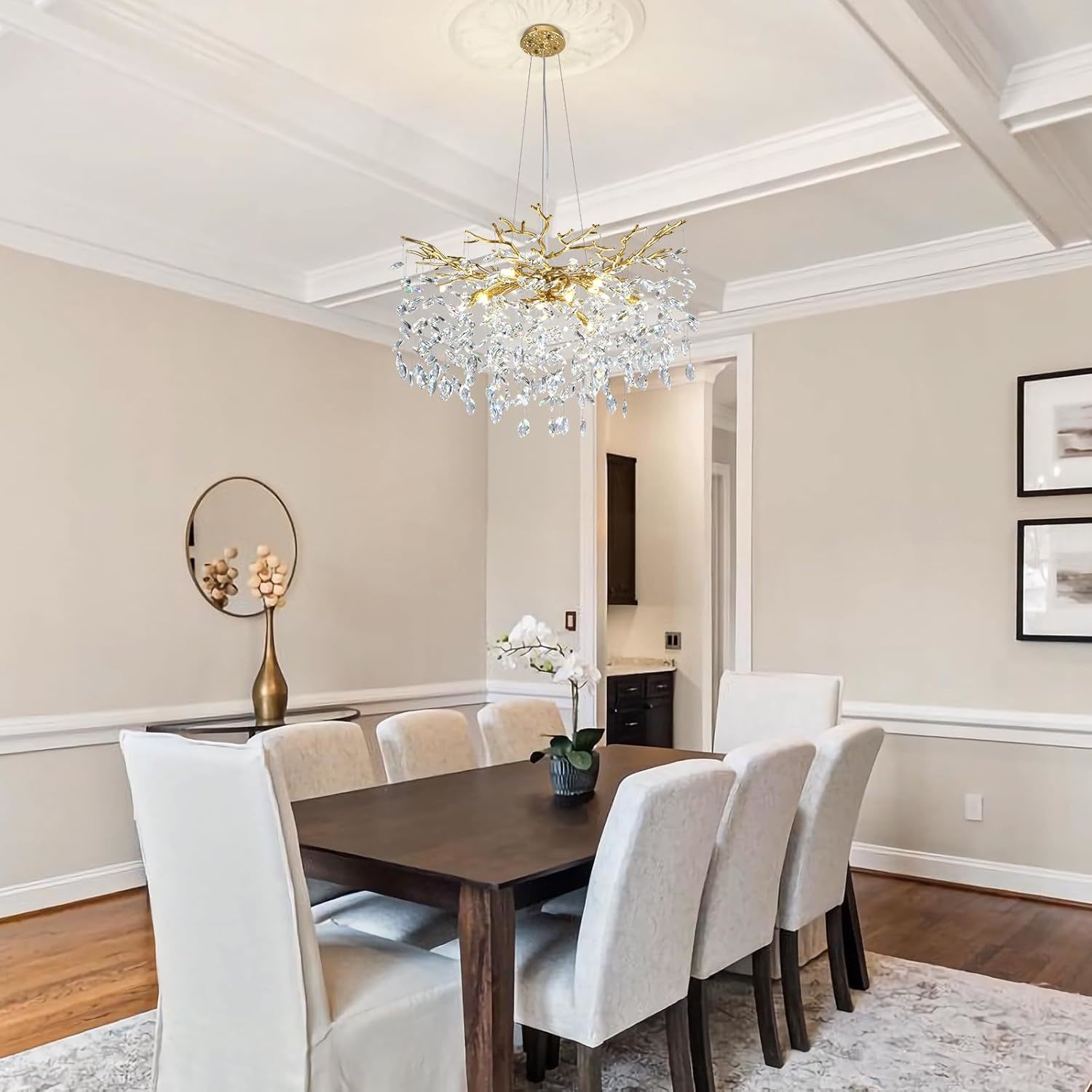 Brand: kvtinmty Color: Gold Material: Aluminum, Crystal Style: Modern?Farmhouse Light fixture form: Chandelier Room Type: Bathroom, Kitchen, Living Room, Bedroom, Dining Room Product Dimensions: 30"L x 30"W x 16"H Specific Uses For Product: Indoor use only Indoor/Outdoor Usage: Indoor Power Source: AC/DC Installation Type: Semi Flush Mount Special Feature: Adjustable Height, Crystal Control Method: Remote Light Source Type: LED Finish Type: Brushed Shade Material: Crystal Number of Light Sources: 10 Voltage: 110 Volts Theme: Space, Fantasy Light Color: White Shape: Round Included Components: Mounting Hardware Embellishment: Crystal Lighting Method: Adjustable Specification Met: UL, ETL Number of Items: 1 Wattage: 40 watts Bulb Base: G9 Controller Type: Push Button Switch Type: Push Button Unit Count: 1.0 Count Water Resistance Level: Not Water Resistant Brightness: 400 Lumen Efficiency: 10 lumens per watt Mounting Type: Ceiling Mount Shade Color: Clear Fixture Type: Non Removable Assembly Required: Yes Manufacturer: kvtinmty Recommended Uses For Product: Indoor Model Name: PL-7760 Part Number: pl-760-115 Item Weight: 29.2 pounds Country of Origin: China Item model number: crystal chandeliers 08 Finish types: Brushed Special Features: Adjustable Height, Crystal Batteries Included?: No Batteries Required?: No Color Temperature: 3000 Kelvin Product Dimensions : 30 x 30 x 16 inches; 29.25 Pounds Item model number : crystal chandeliers 08 Manufacturer : kvtinmty Country of Origin : China Brand: kvtinmty Color: Gold Material: Aluminum, Crystal Style: Modern?Farmhouse Light fixture form: Chandelier Kvtinmty Modern Crystal Chandelier: Transform your living space into a captivating masterpiece with our elegant gold crystal tree branch chandelier. This stunning piece is designed to impress, featuring a unique tree branch-inspired structure adorned with shimmering TOP K9 crystals that create a mesmerizing interplay of light and shadow. Crystal Chandelier Light Source: This round branch crystal chandelier does not include light bulbs. It requires 10 G9 bulbs, which can be chosen according to your preferred color temperature to complement your home decor. We generally recommend using 3000K warm white bulbs for a cozy ambiance. The chandelier is dimmable when paired with dimmable bulbs and a compatible dimmer switch. Humanized Installation: The modern gold crystal chandelier measures 30 x 30 x 15.5 inches, with an adjustable cable length of 0-66 inches to suit your space. The chandelier?s branches are crafted from lightweight aluminum alloy using one-piece molding, providing both durability and adequate support. Each branch is removable for easy assembly?simply hang the crystals from the branches. (Note: The branches have distinct sides; please install the chandelier with the front side facing upward. Refer to the provided installation instructions for detailed guidance.) Application Space: This round crystal chandelier for the dining room resembles a golden tree, illuminating and warming the entire house while also serving as a beautiful decorative light. The ceiling canopy of the chandelier is compatible with both flat and sloped ceiling installations. In addition, it is perfect for the living room, kitchen island, bedroom, foyer, bathroom,high ceiling space, and any other space. Our Promise:We Provide 5 Years Promise For All Chandeliers, Including Replacement Of Lost Or Damaged Parts. If You Encounter Any Problems In The Installation Process Can Contact Us In Advance, We Will Reply You In Time And Communicate With The Technical Department To Help You Solve, Please Be More Patient, You Will Love It After Installation!