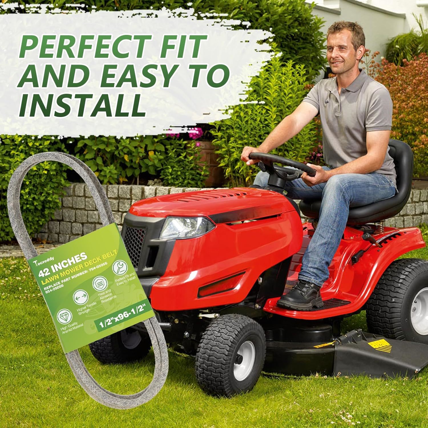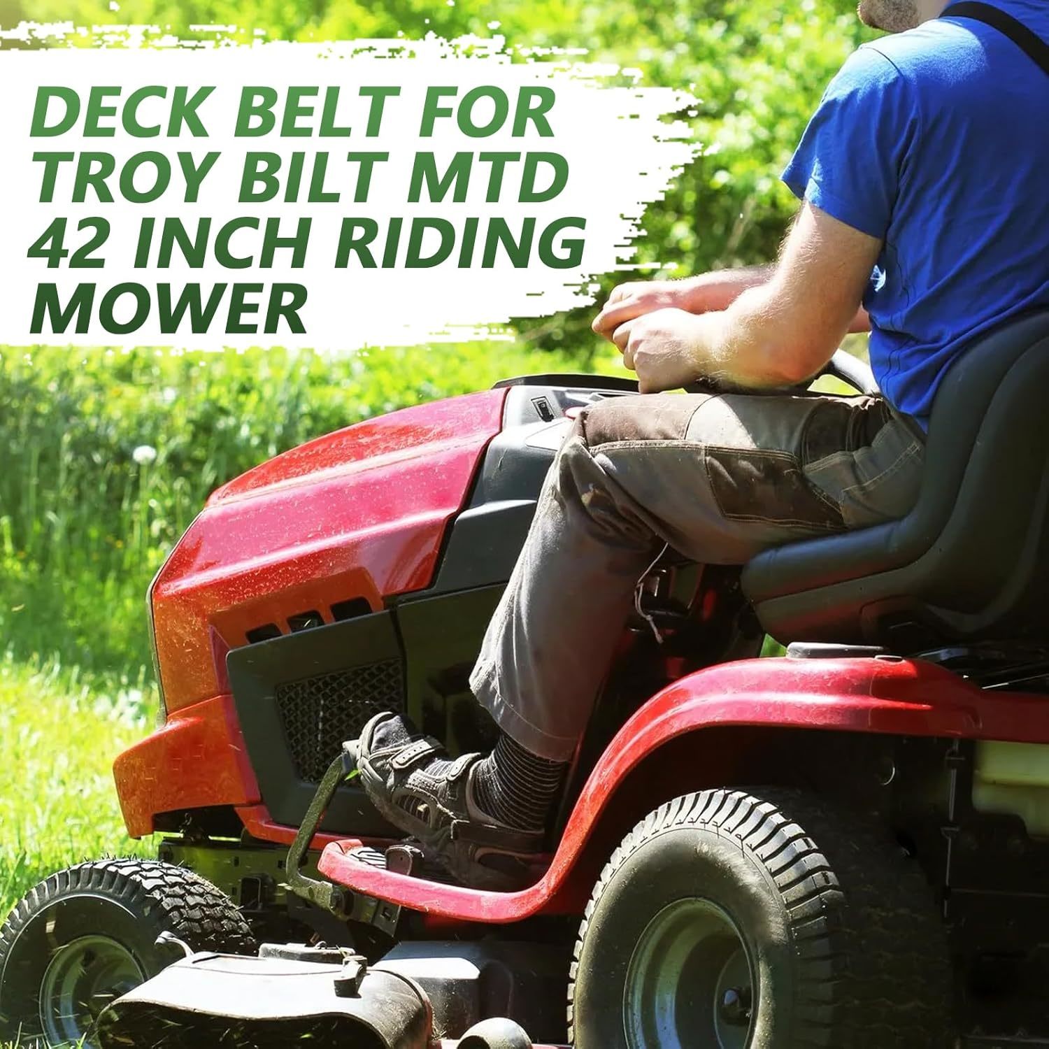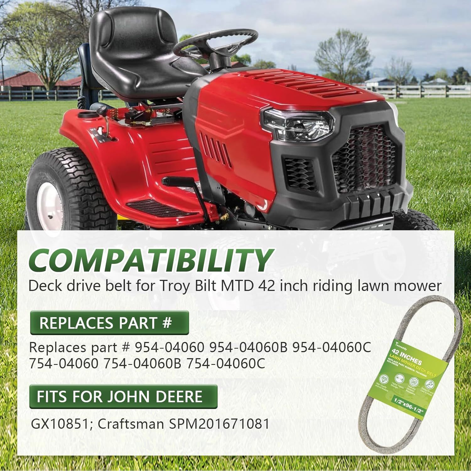 ?Compatibility?Deck drive belt Compatible with Troy Bilt MTD 42 inch riding lawn mower replaces part # 954-04060 954-04060B 954-04060C 754-04060 754-04060B 754-04060C. Compatible with John Deere GX10851; Craftsman SPM201671081. ?Compatibility?Deck belt for 42 inch lawn mower fits Compatible with Troy Bilt 42" Pony 42 42T 42X, Bronco, TB42 TB46 TB1942 TB2142 TB2246 riding lawn mower tractor. Compatible with Cub Cade LT1042 LTX1040 LTX1042 LTX1042KH LTX1042KW LTX1045 lawn tractor. ?Premium Material?Lawn mower deck belt is made of high-quality Aramid and Neoprene, which is heat and abrasion resistant and non-conductive. Higher tensile strength, heavy duty. Replacement drive belt provides reliability for the lawn mower, helps maintain the best performance and extend the service life of riding mower. ?Easy to install?Belt Size:1/2" width x 96-1/2" length. Deck belt replaces the lawn mower small engine drive belt with accurate size and convenient installation. Ensure the smooth work of riding mower, prolong the life of lawn tractor. ?Package List?Package includes 1* deck belt for Troy Bilt MTD 42 inch riding mower. Pls contact us freely if you have any questions for lawn mower drive belt.
