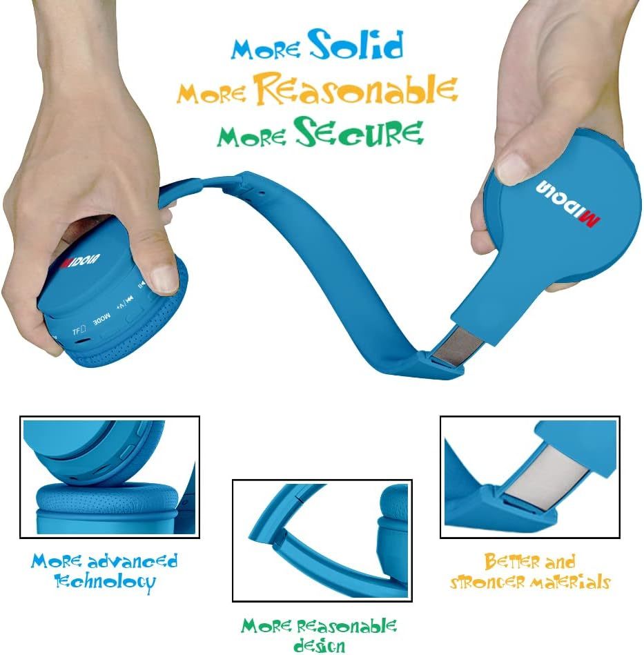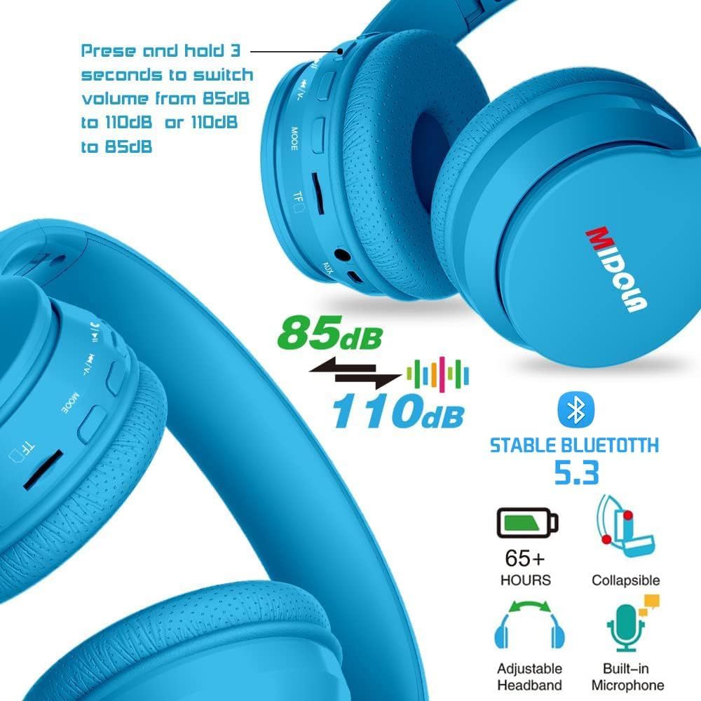 (Switched 85dB :Kids to 110dB :Aldult )Hearing Protection: Midola Kids' (Age 2 Years+)headsets protect your kids from hearing hurting when they play for a long time with 85dB of limited volume(the level the World Health Organization considers safer). The volume can be switched from 85dB (Kids)to 110dB (Aldult ) when you press and hold pause/play button 3 seconds. Multifunctional Bluetooth Headphones: 60 hrs playtime Bluetooth headphones(hands-free calling) /Aux-in.Your little ones can listen anytime in both a wired and wireless capacity. The wireless design is handy for avoiding tangles, a favorite feature of the big-kid panelists. However, the cord is detachable, minimizing a toddler's risk of getting snagged, but the volume restriction of wired headphones is normal. Comfortable and Collapsible Design: The adjustable headband gives the headphones some impressive flexibility, so they can adapt to the shape of your head for a perfect fit.Soft ear cushions and long-wearing comfortable without stress, fit for growing teens even adults. It's your kid's great travel partner, let your little ones enjoy the journey without bothering you. High Compatible With Most Device: Standard 3.5mm audio jack suitable for listening to music or audiobooks. Quickly pairing with the most Bluetooth devices device: for iPhone for iPad/ Android Cellphones/ PC and Tablets. Crystal stereo sound-40mm dividers, produce high-quality sound, create an amazing experience. Ideal Gift Choice for Kids(3-16+?(Easy put in school bag):: Please note: No FM radio ,?SD Card) function not work right.