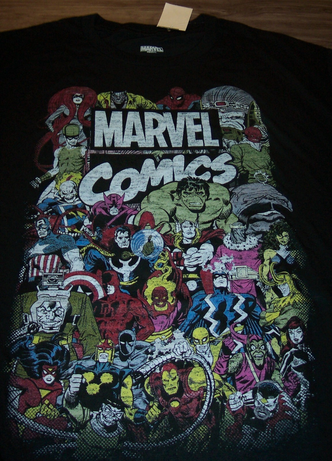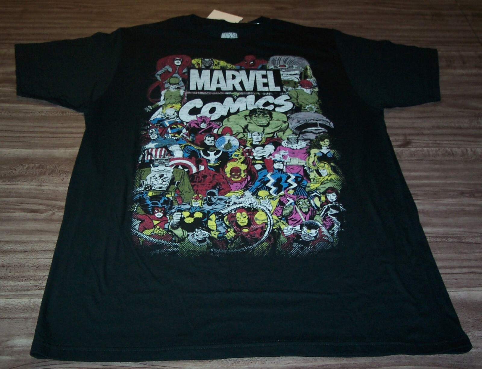 This is a VINTAGE STYLE MARVEL COMICS HEROES AND VILLIANS T-shirt. It is a size MEDIUM, and it is NEW with the tag. It is 20 inches from armpit to armpit and 29 inches in length. The print is made to look vintage. Nice shirt with a ton of characters. SPIDER-MAN HAWKEYE, THE INCREDIBLE HULK, THOR, THE BLACK PANTHER, IRON MAN, GREEN GOBLIN, DOCTOR OCTOPUS, VISION, CAPTAIN AMERICA, DR. STRANGE, GHOST RIDER, RED SKULL, LOKI, DAREDEVIL, LUKE CAGE, SHE HULK, BLACK WIDOW and many more. Officially Licensed. Combine auctions to save on shipping. AD