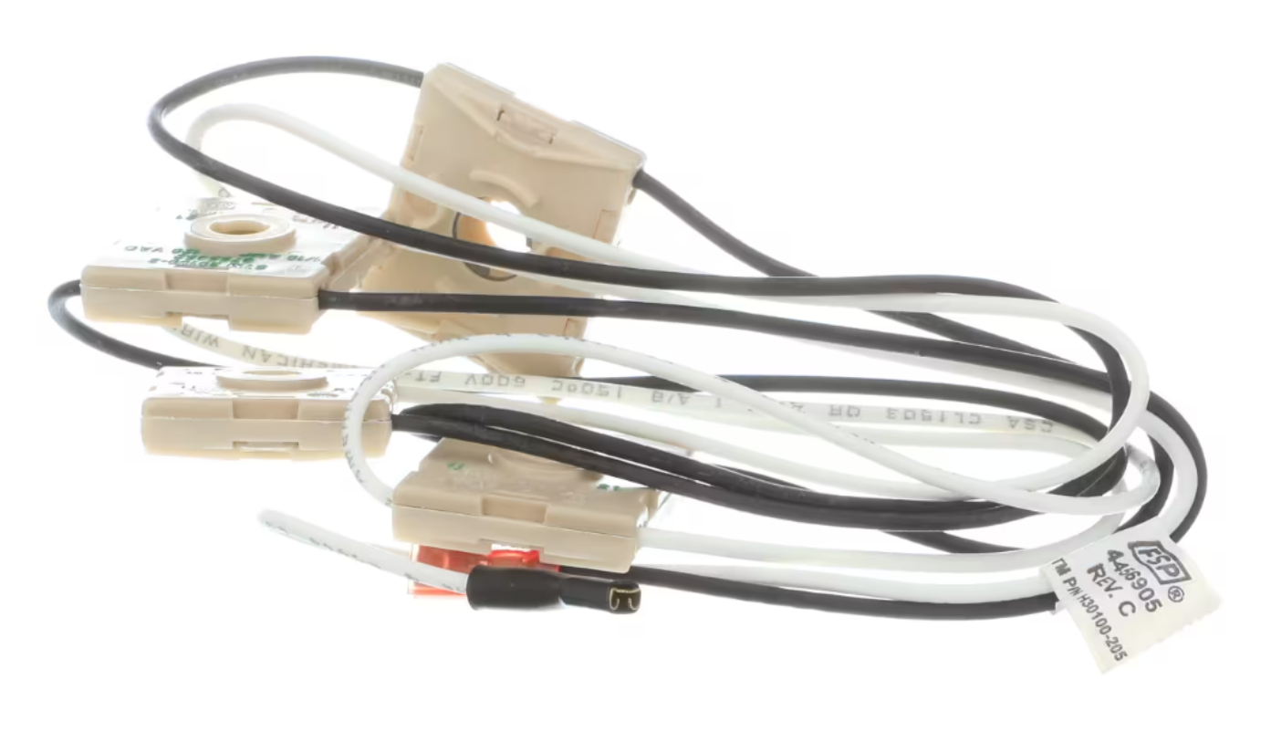The Whirlpool 4456905 Wire Harness Ignition Switch Assembly (also known as H30100-205) is a genuine OEM component designed to control the ignition of gas burners on your cooktop. It ensures safe and reliable operation by transmitting power from the control knobs to the igniters, allowing consistent burner ignition.