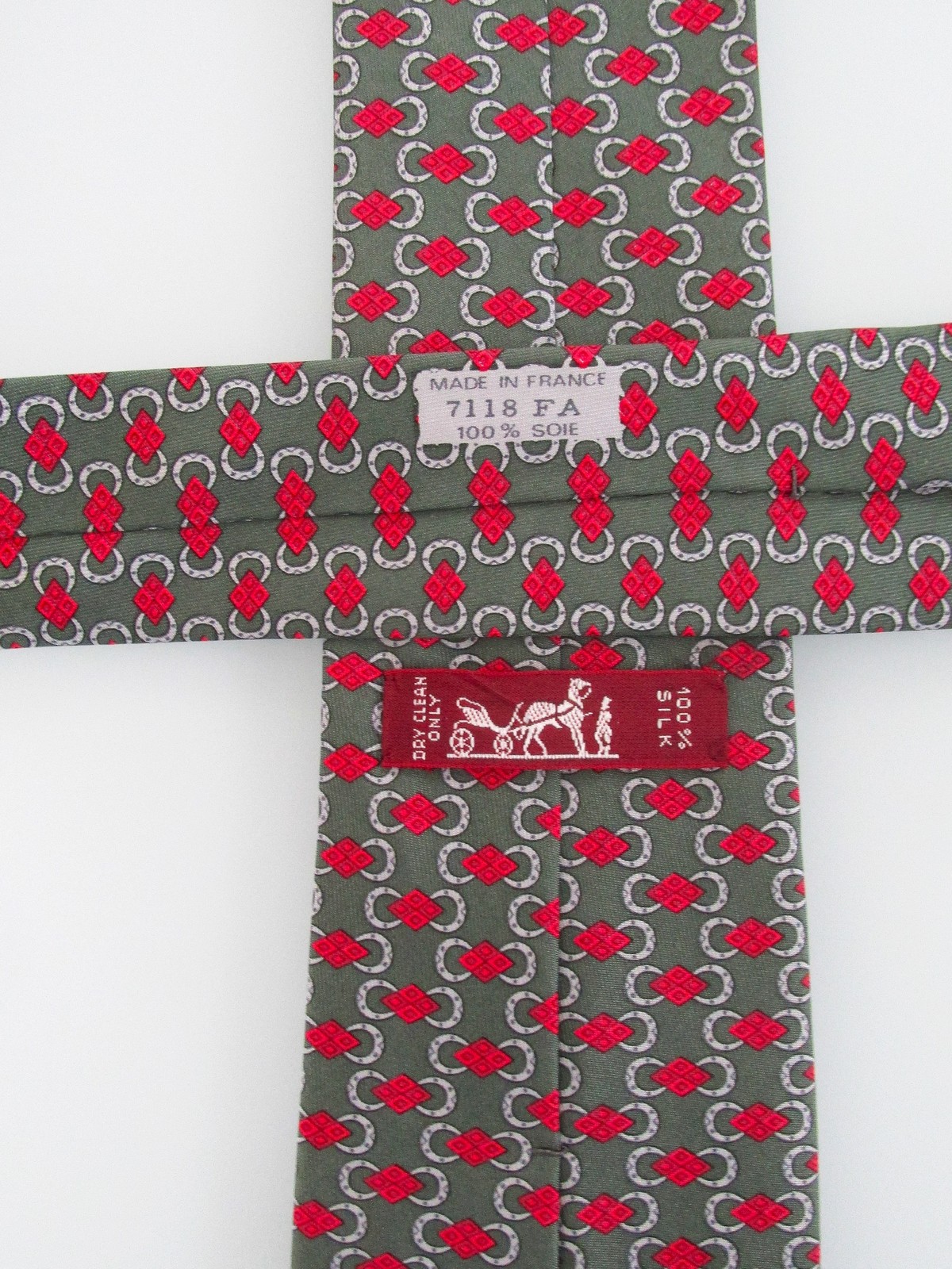 Description: Up for sale is a Hermes men's silk tie. The print # 7118 FA. Hermes ties are made in France of the finest silk. All Hermes ties are handmade hand-finished. Dimensions are approximately 56" long x 3 3/8" wide. It has a multicolored abstract motif in red, white black on a green background. This tie is in excellent condition.